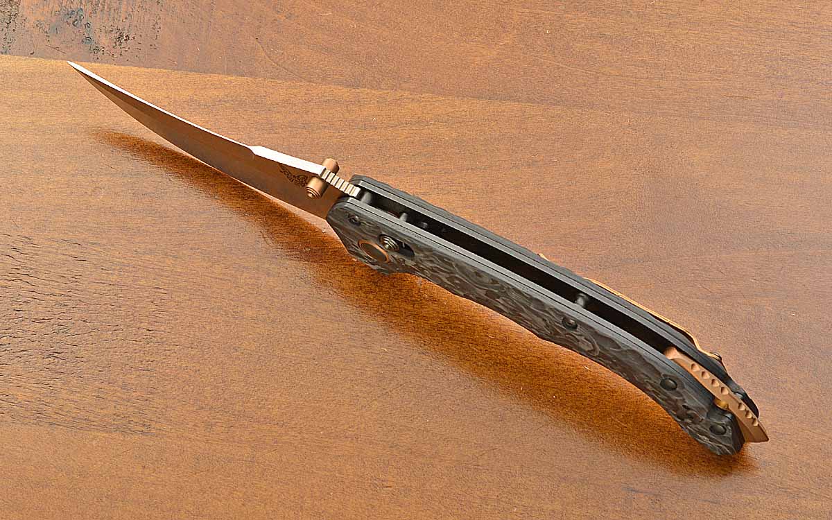 - Dark Copper PVD coated thumb stud, pocket clip, and thumb notched back spacer