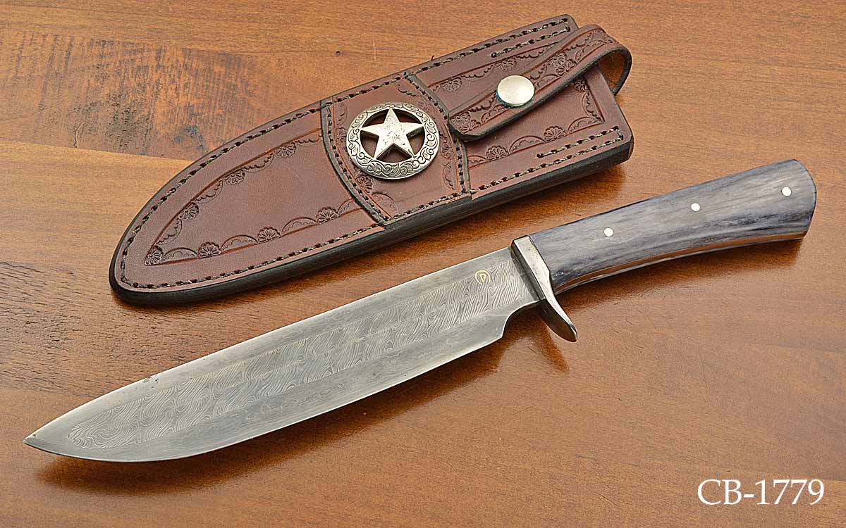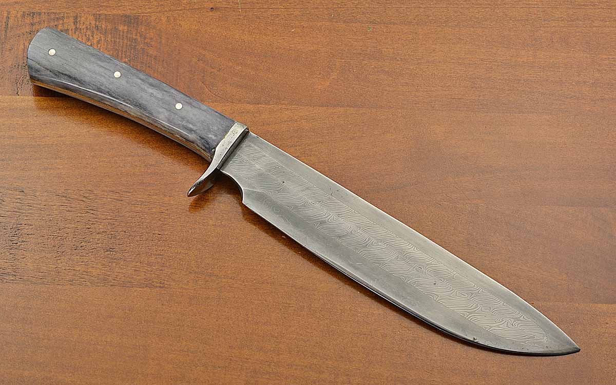- 8 1/8" multi-bar Damascus blade, forged by maker, 13" overall length