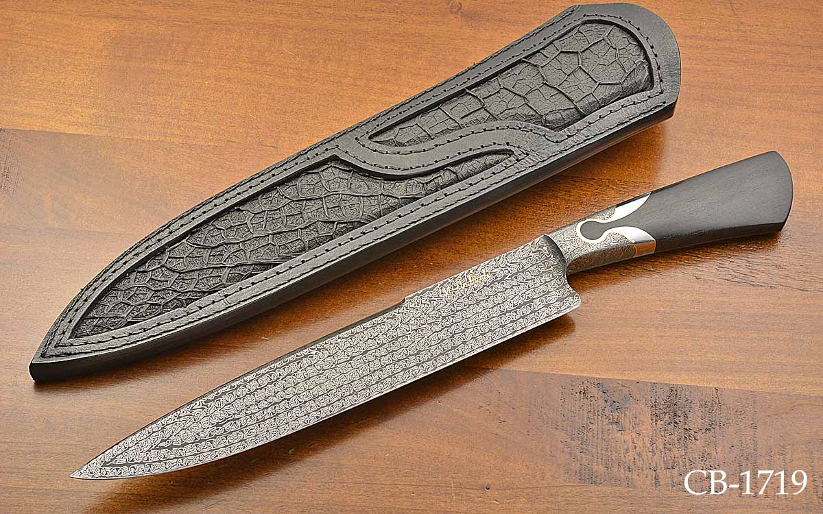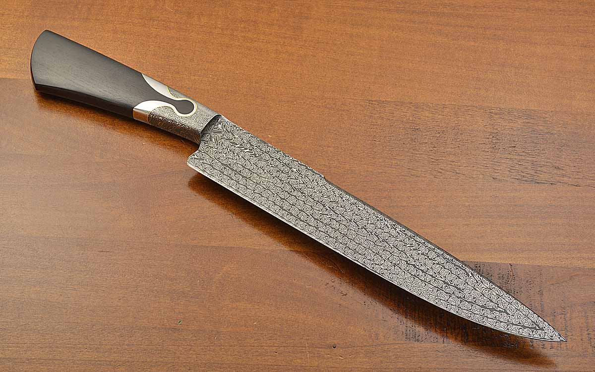 - 9 1/2" mosaic Damascus blade, forged by maker, 14 1/2" overall length