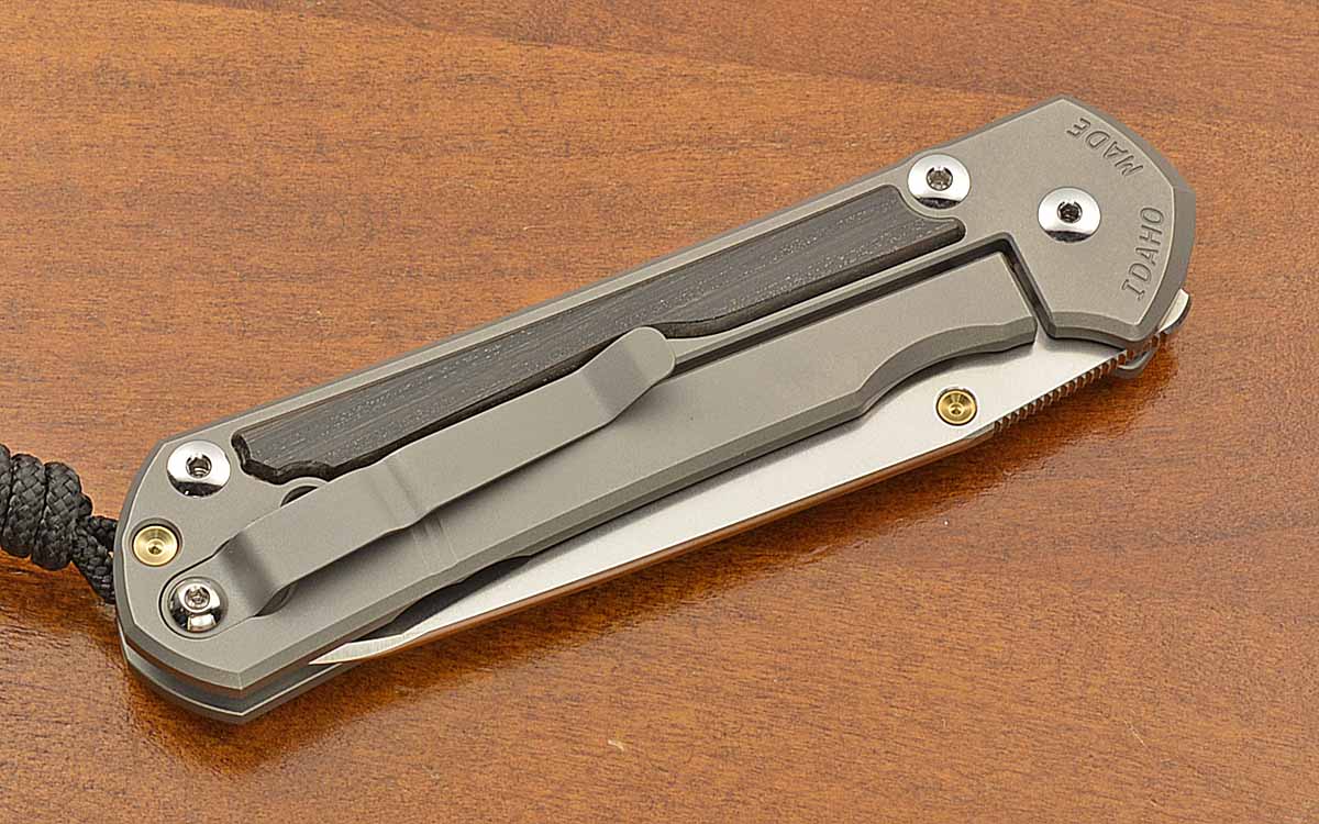 - Gold anodized titanium thumb lug, back spacer, and lanyard pivot