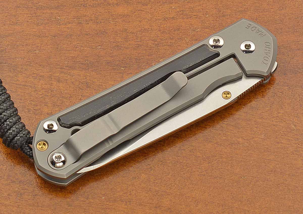 • Titanium frame and pocket clip with bog oak wood inlays