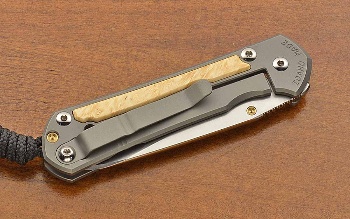 - Gold anodized titanium thumb stud, back spacer, and lanyard pivot