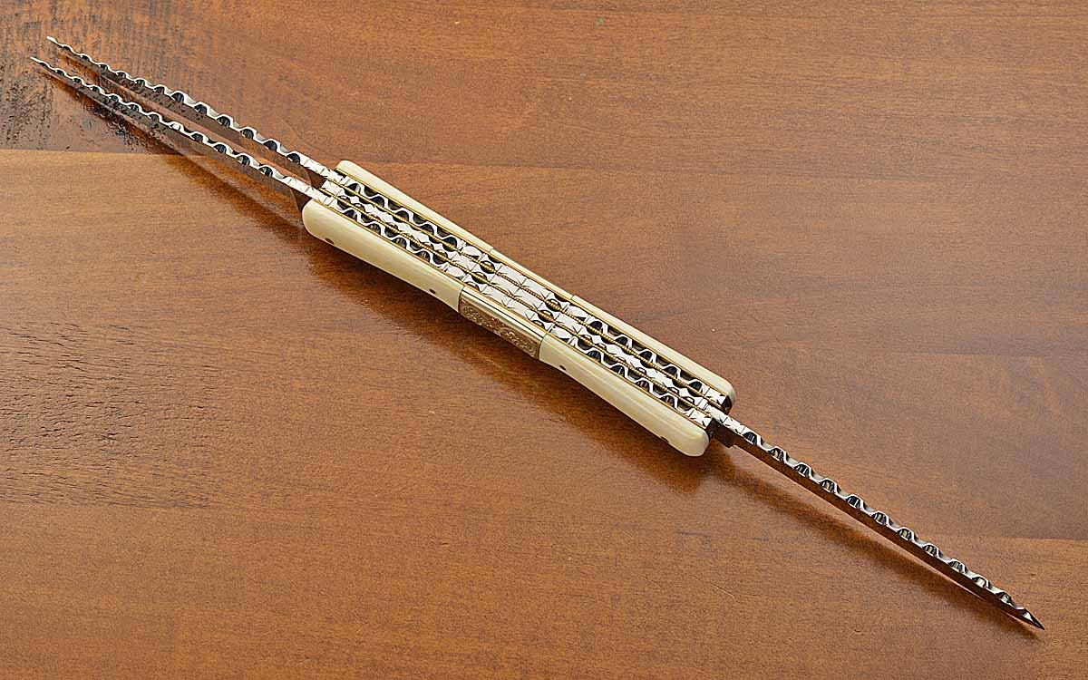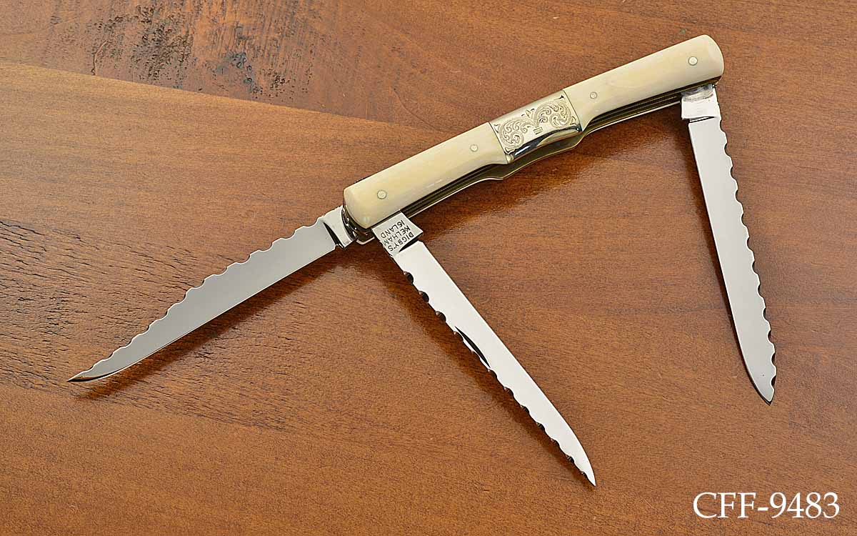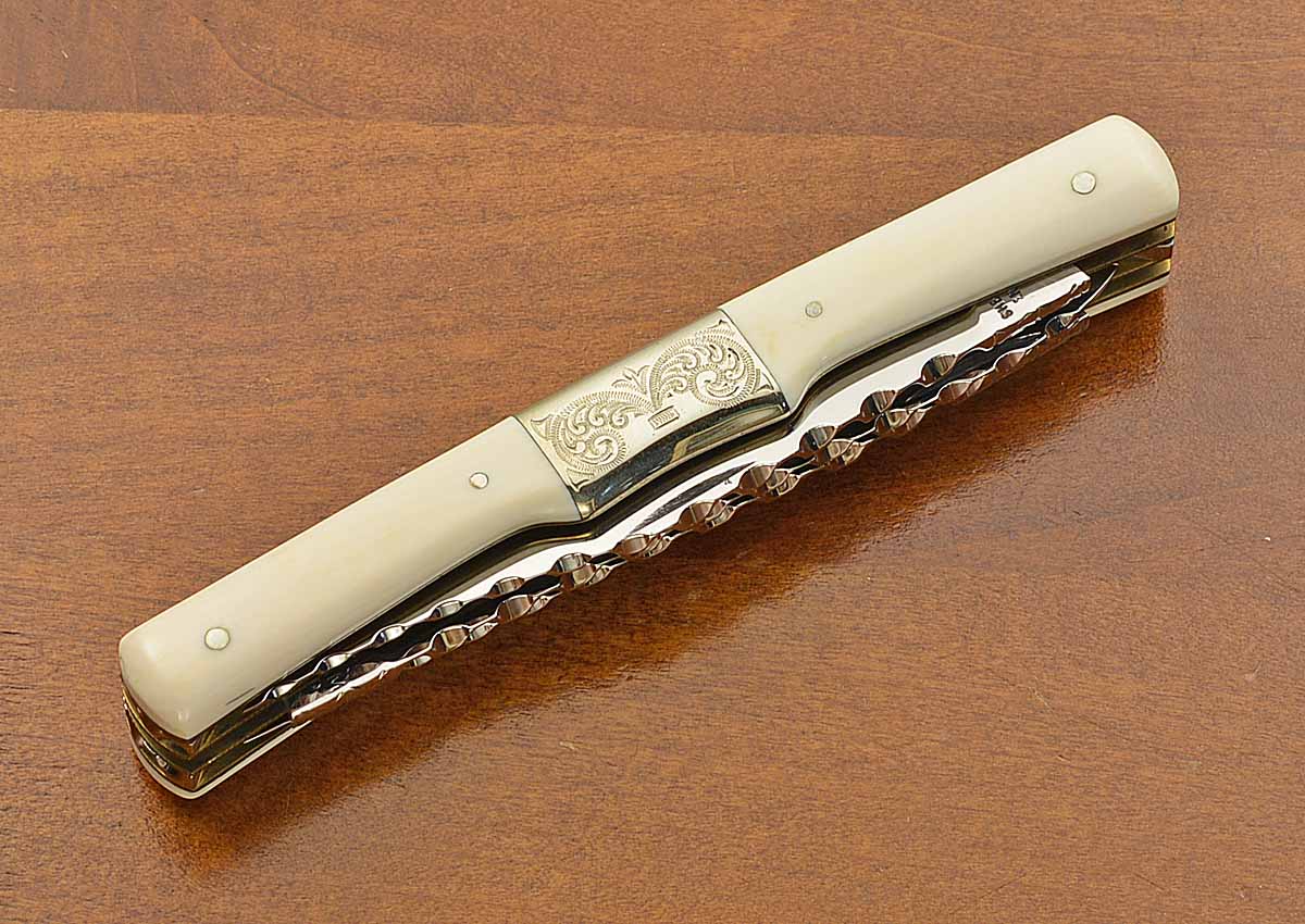 - Ivory scales with engraved nickel silver center bolsters