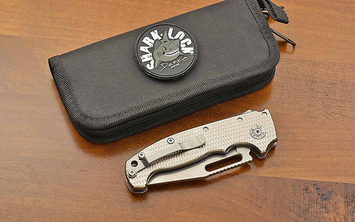 - Thumb notched blade spine and stainless steel Shark-Lock