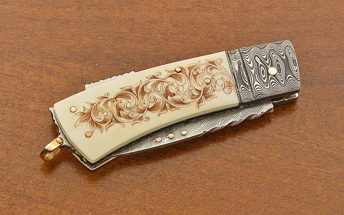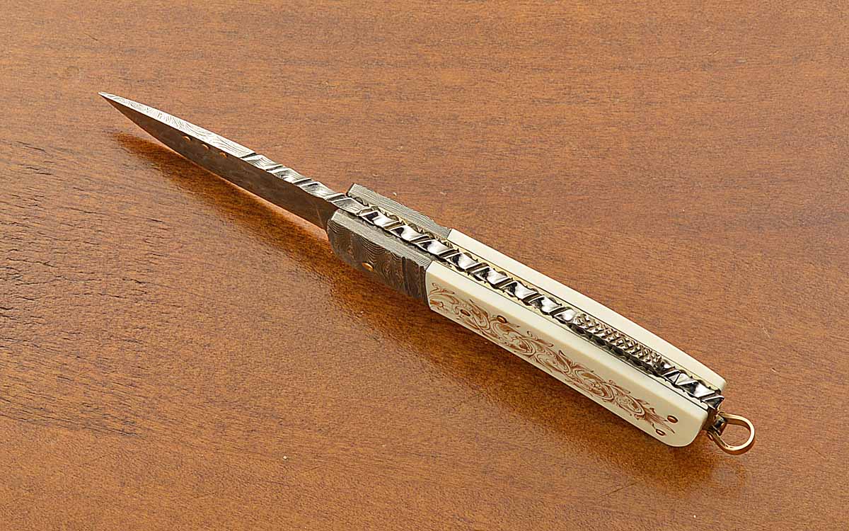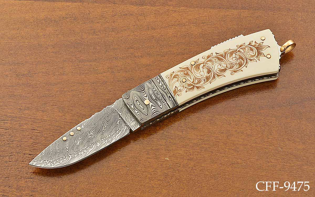 - 2 1/8" three-bar Damascus blade, 5 1/2" opened length