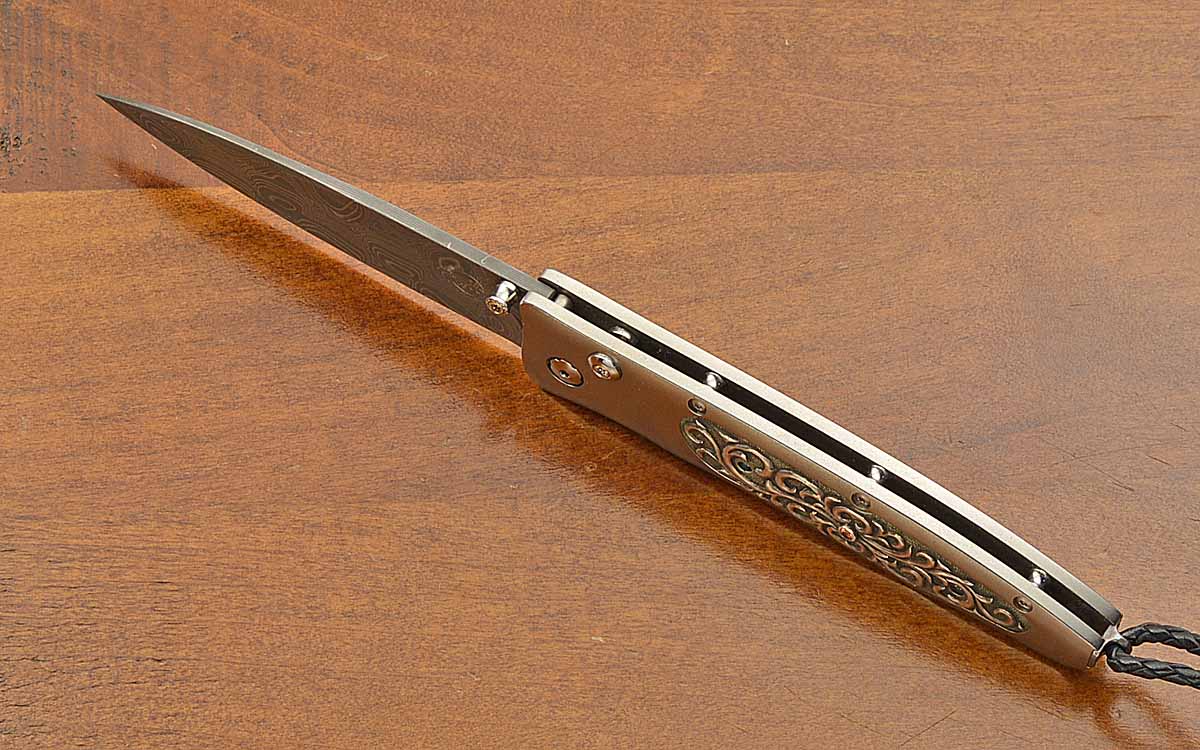 - 3 1/8" "Typhoon" Damascus blade by ROB THOMAS, 7" opened length