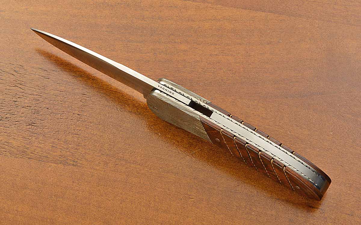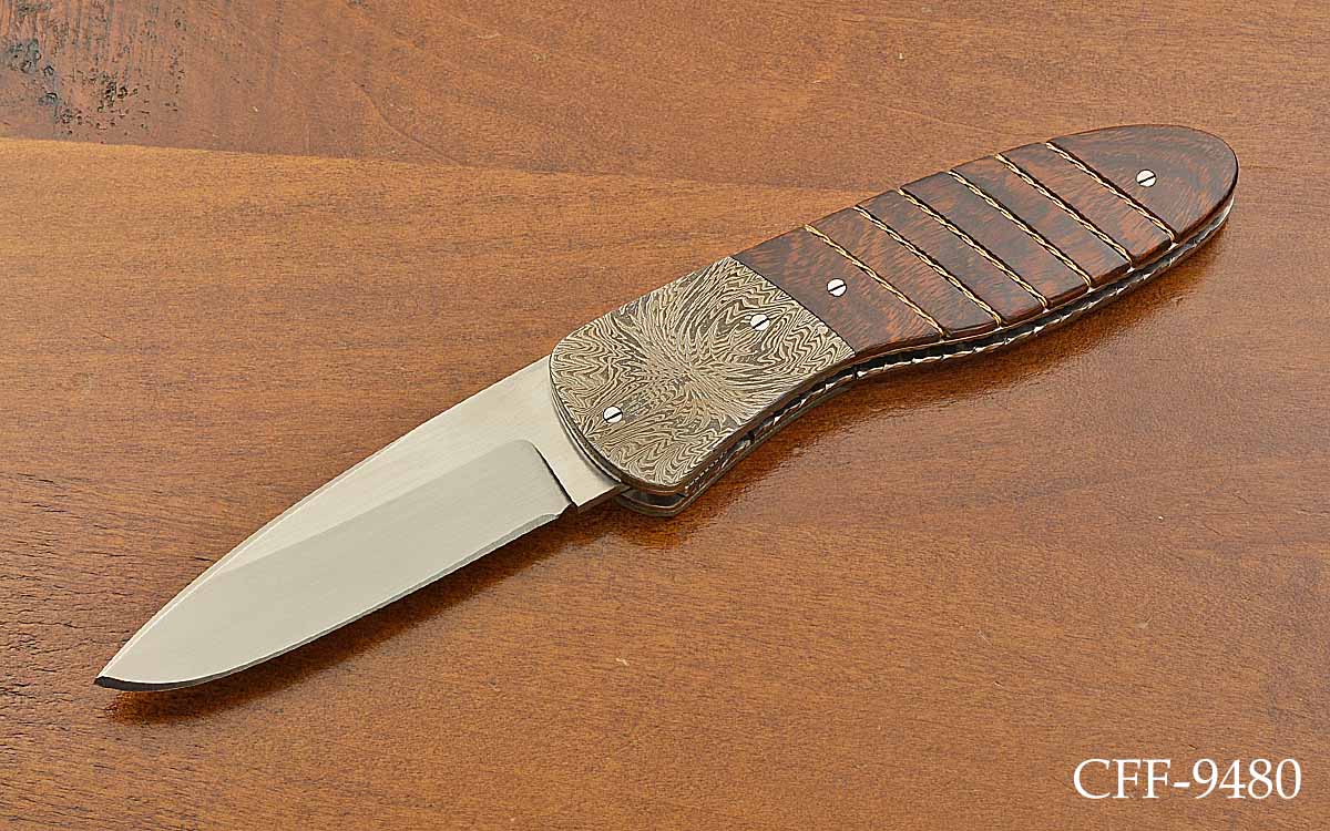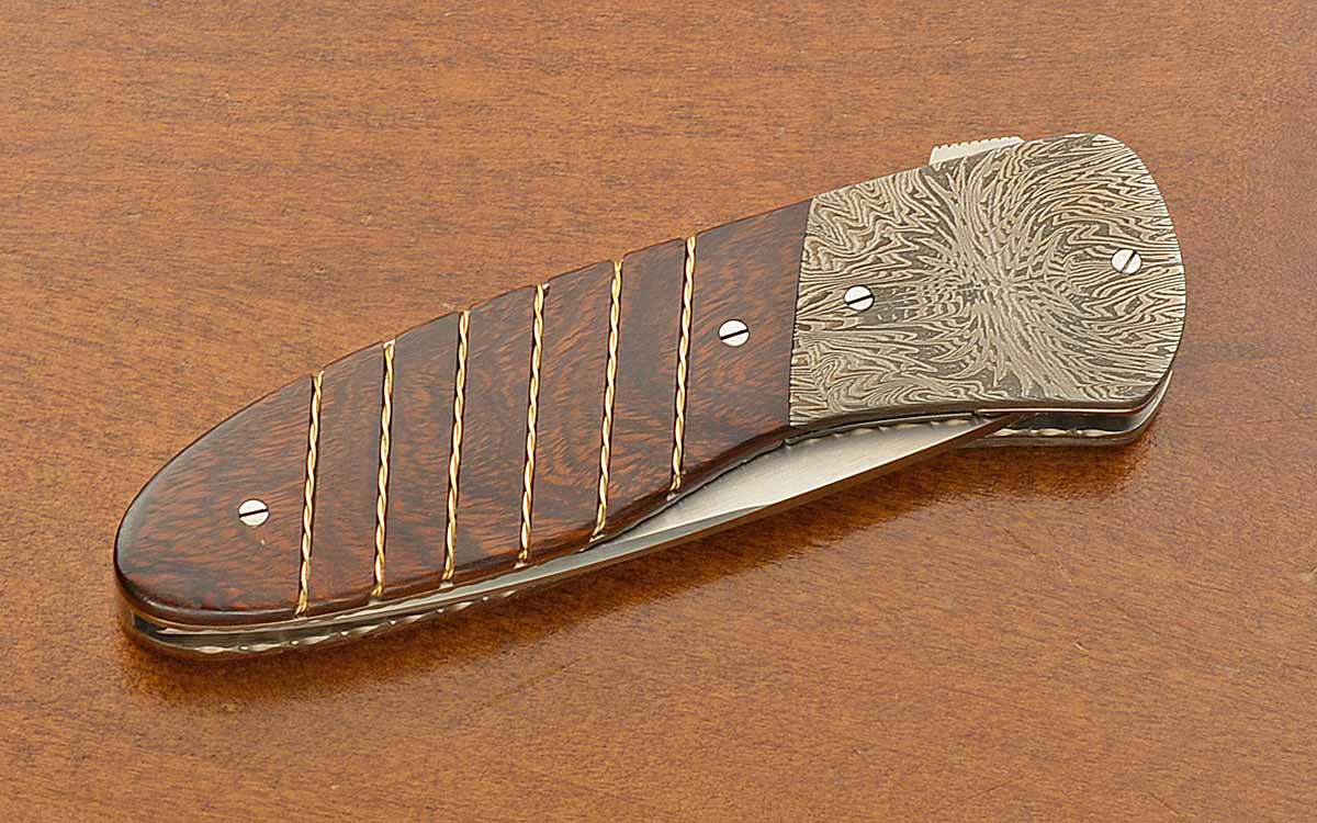 - Dovetailed ironwood scales with twisted gold wire inlays