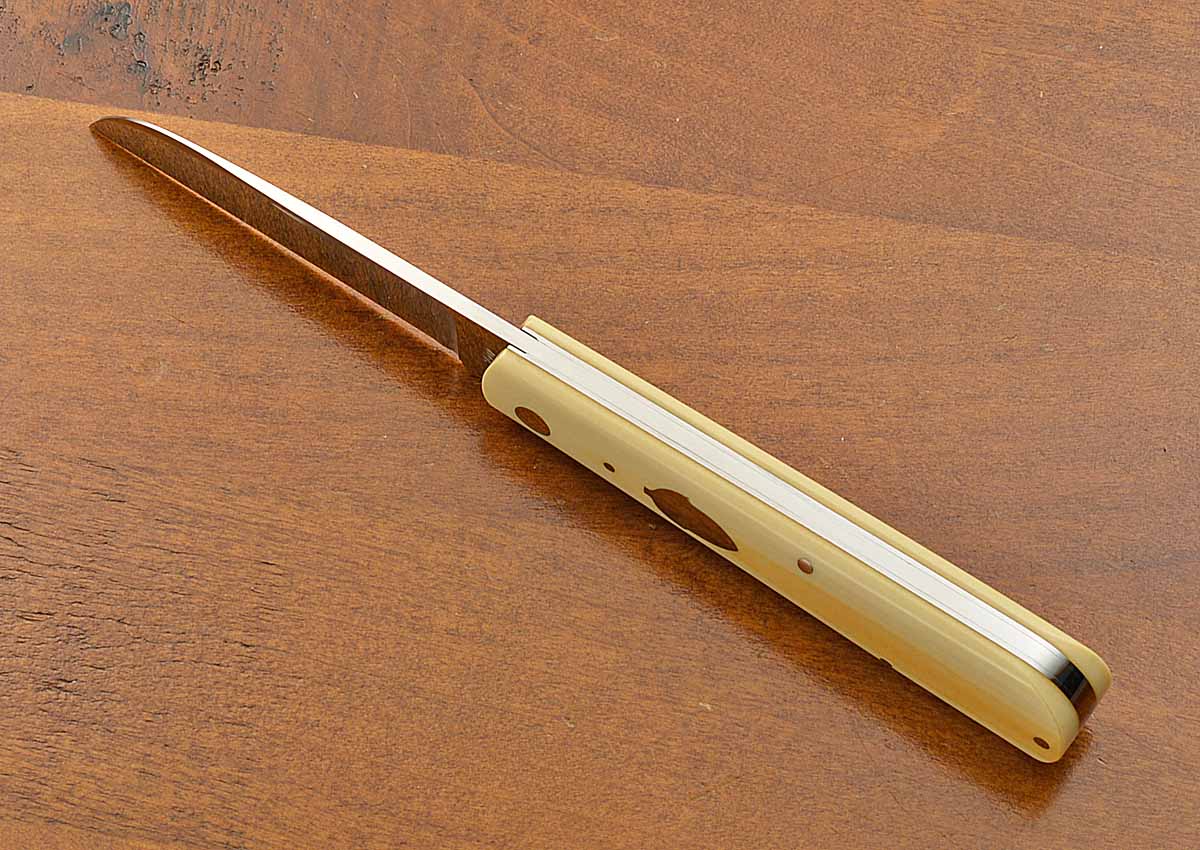 - Ivory micarta scales with stainless steel acorn escutcheon