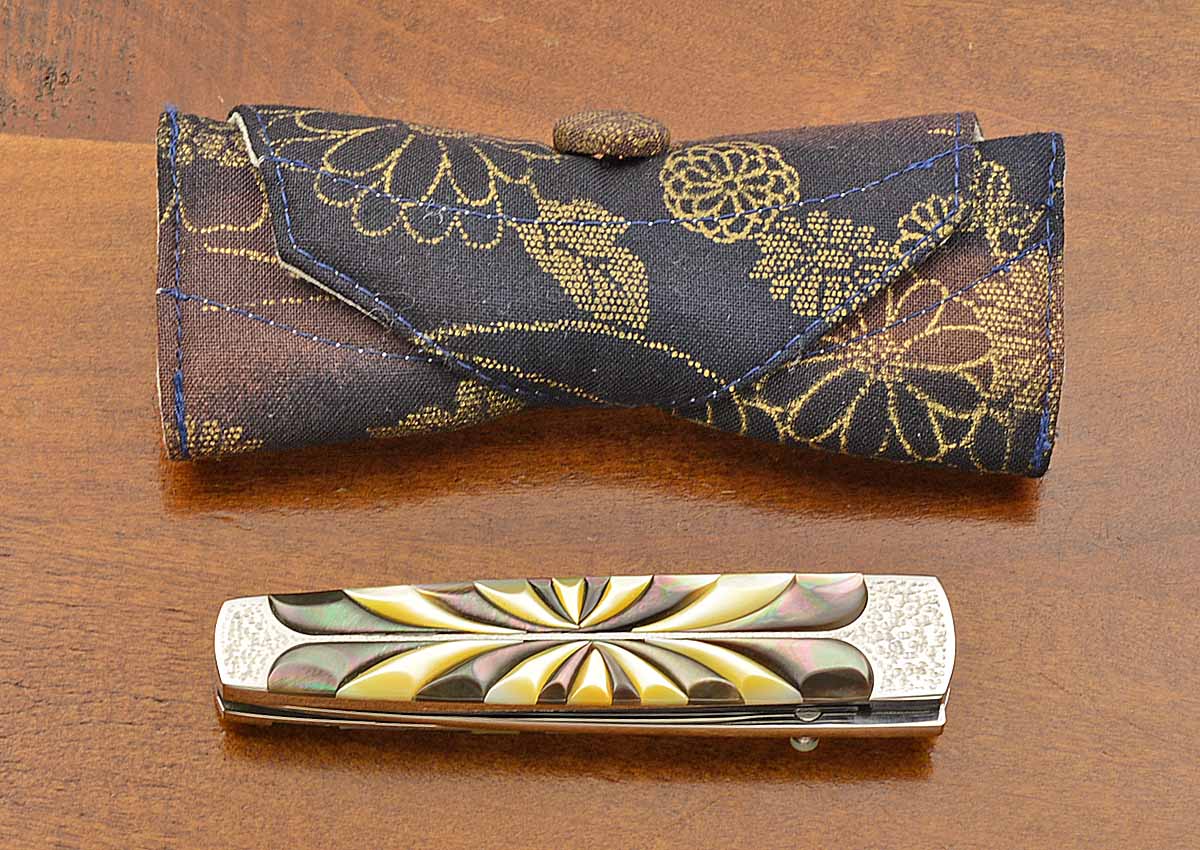 - Stippled stainless steel frame with alternating carved black and gold lip mother of pearl inlays