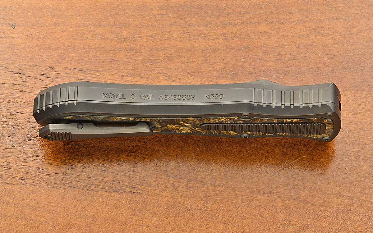 - 3 1/2" blade of M390, black DLC coating, 8 1/2" opened length