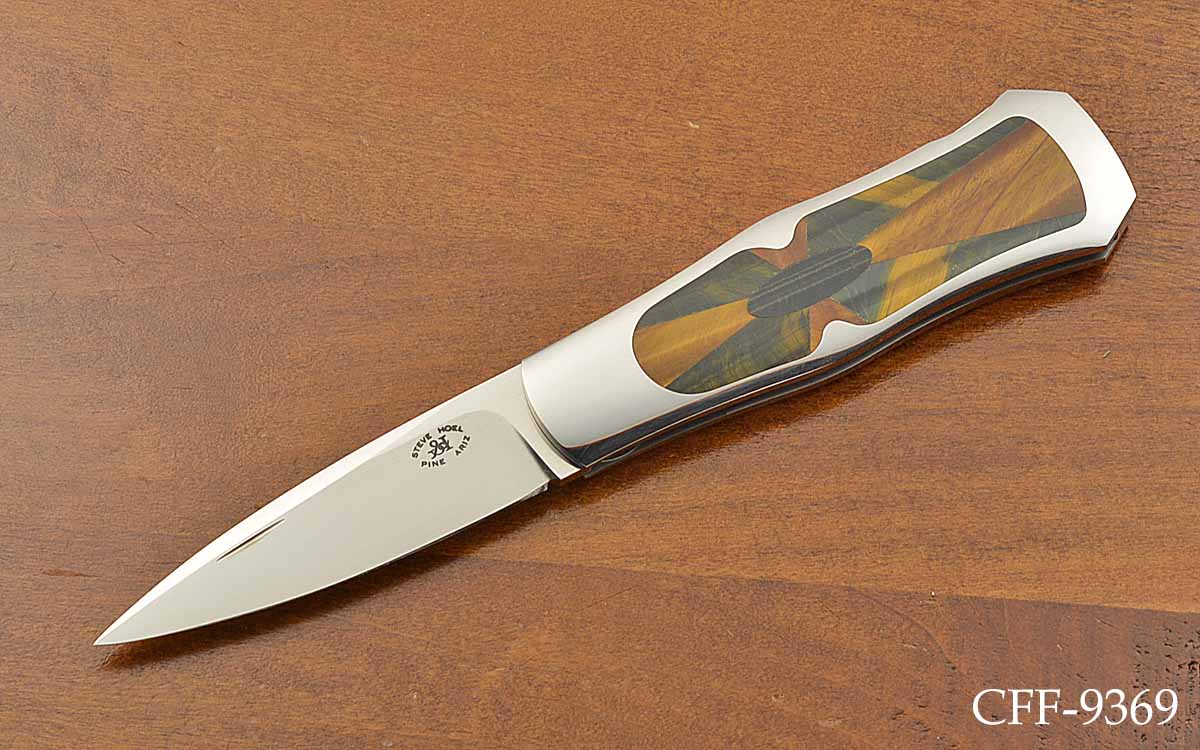 • Polished stainless steel interframe with a green and gold tiger eye stone mosaic inlay