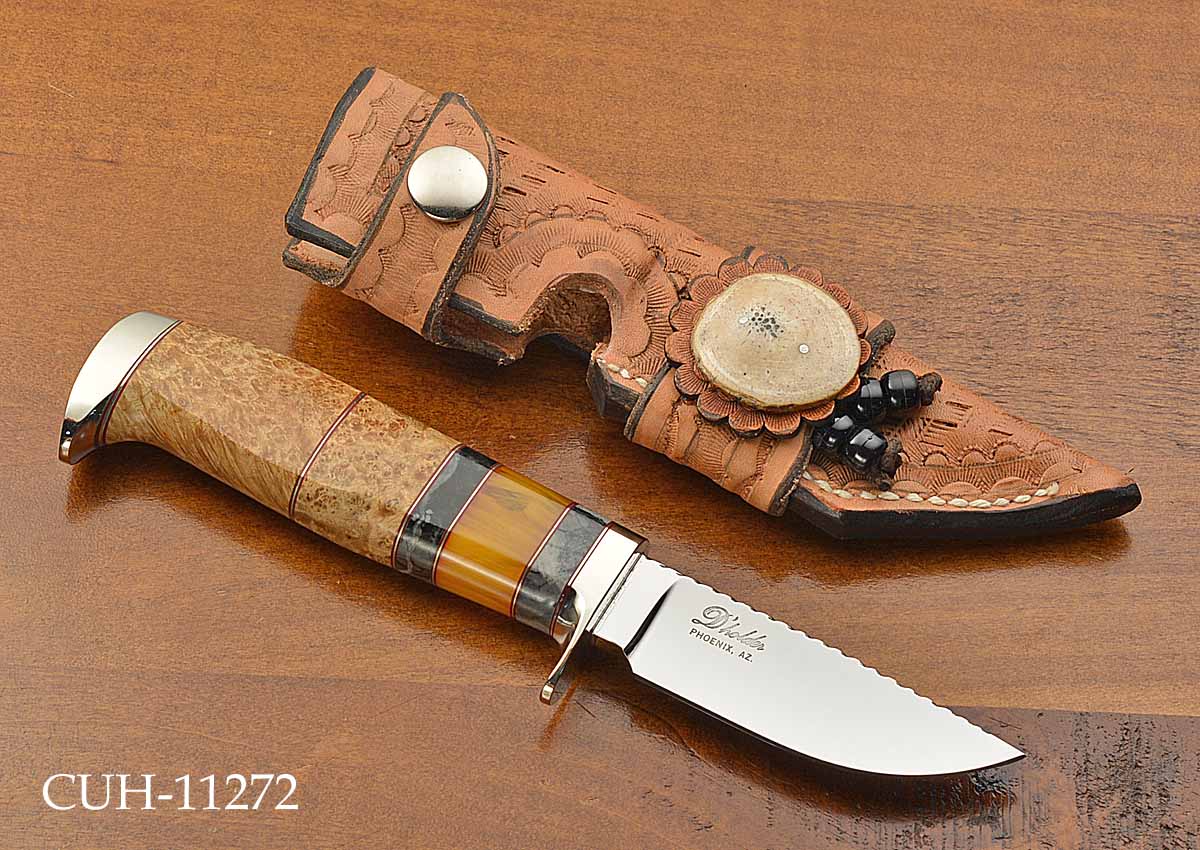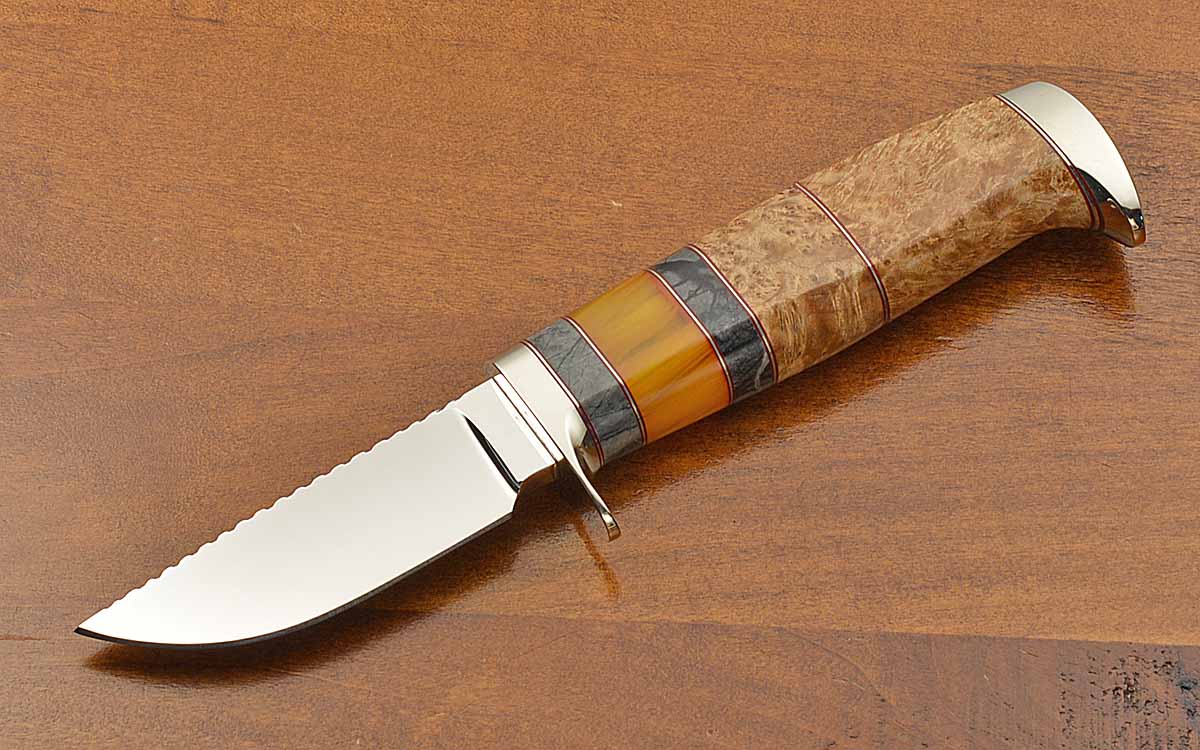 - Maple burl, amber, and jasper stone handle with fine red and nickel silver spacers