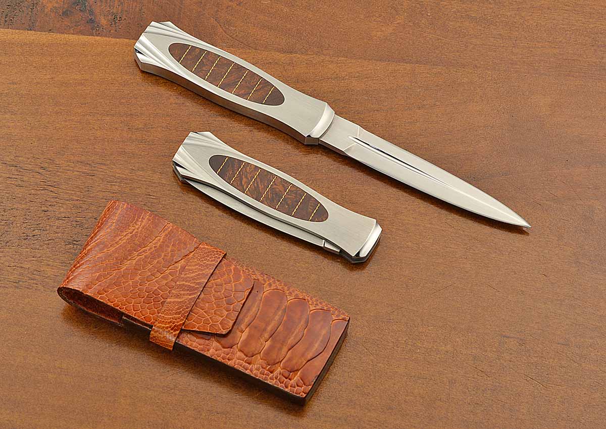 - Includes a beautiful ostrich hide pocket sheath with gold pins for the folder, padded storage pouch for the fixed blade