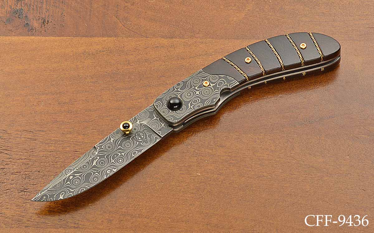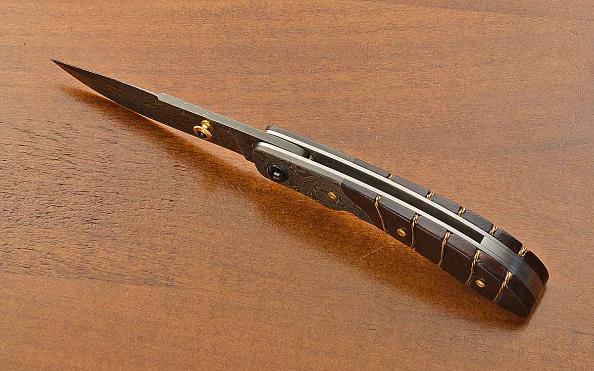 - 3 1/8" Raindrop Damascus blade, 7 1/8" opened length