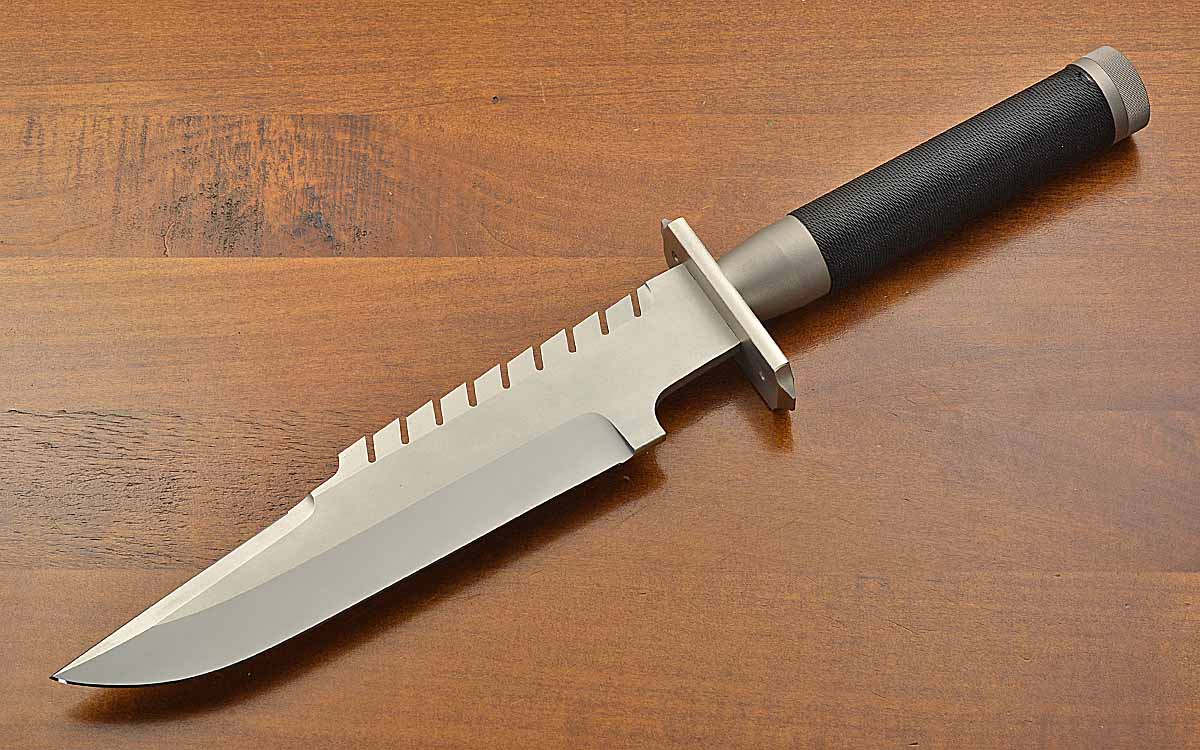 - 9" blade of N690, bead blasted finish, 15" overall length
