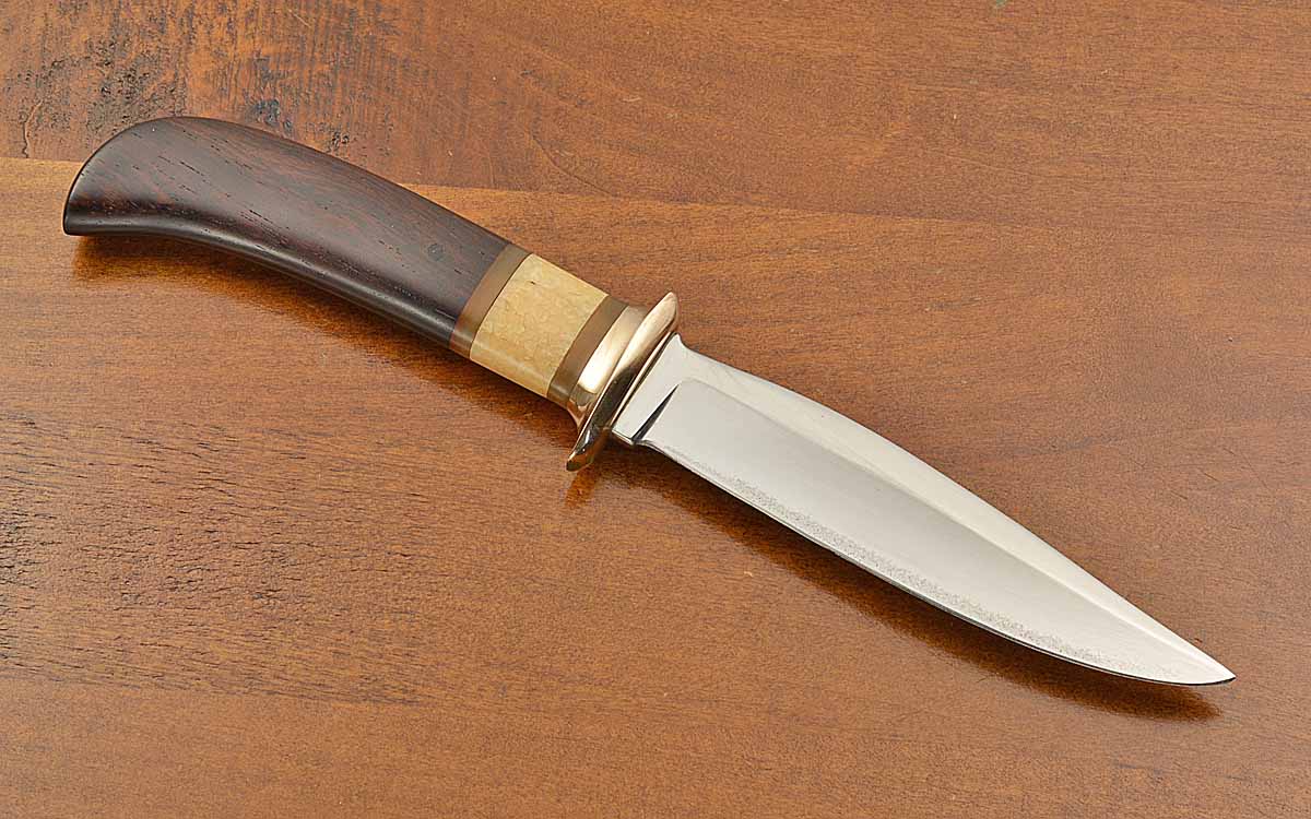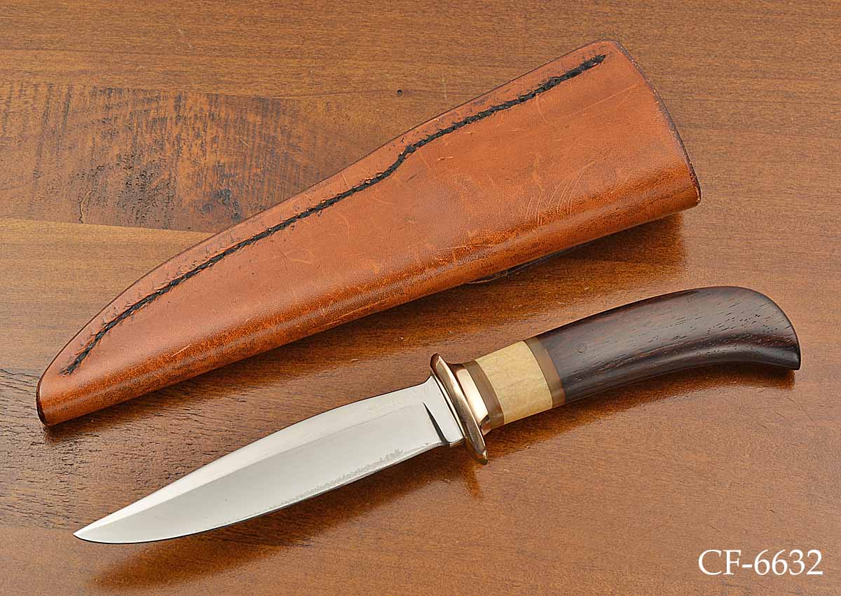 - Rosewood handle with fossil walrus ivory and horn spacers