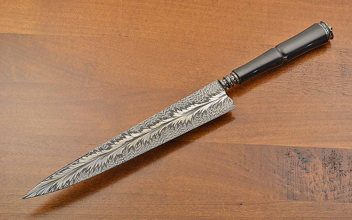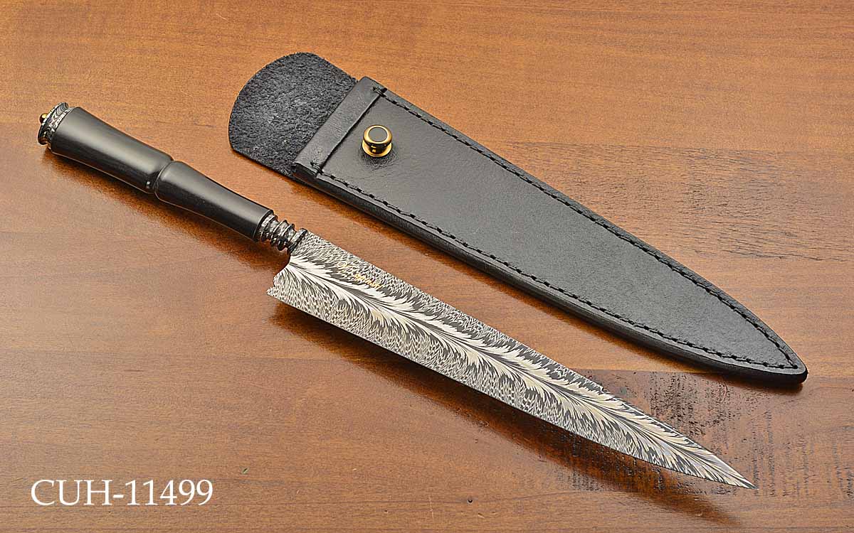 - 8 3/8" Feather Damascus blade, 13 1/2" overall length