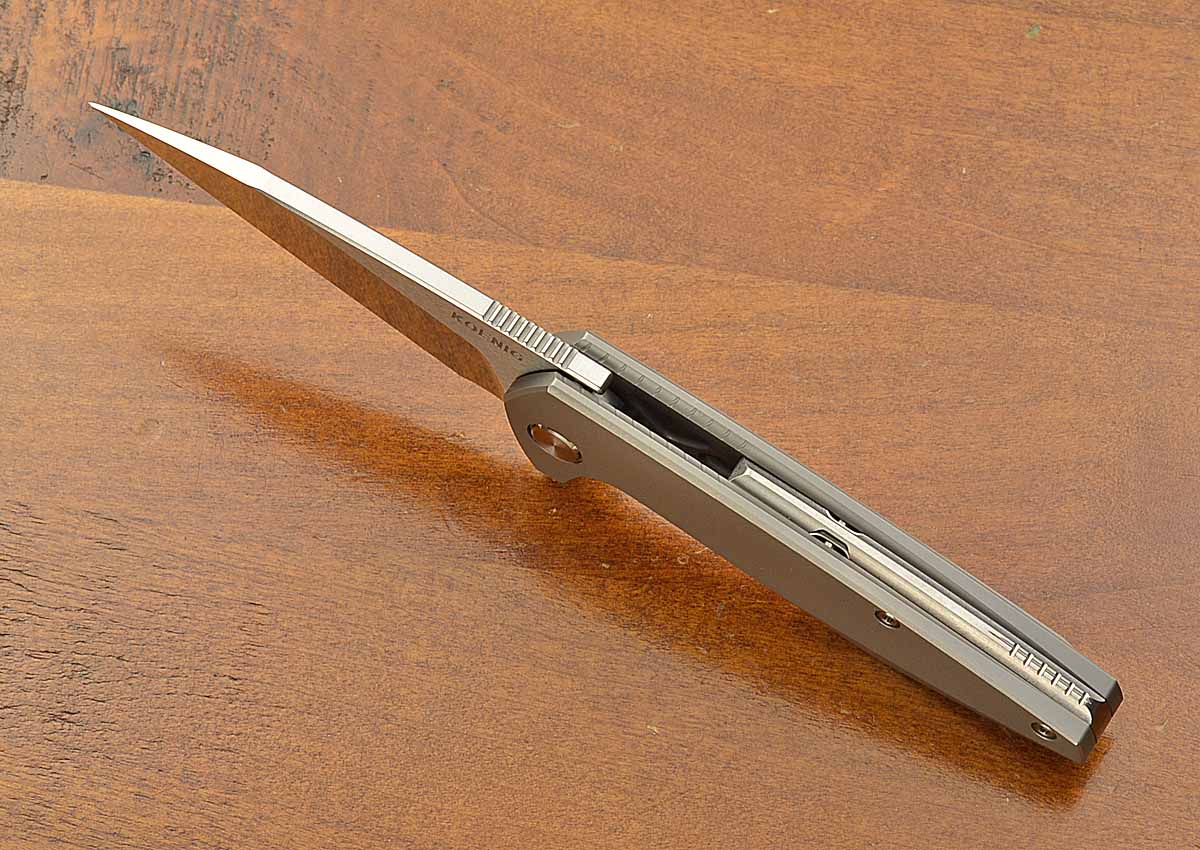 - 3 1/16" blade of M390, two-tone satin and stonewashed finish, 7 1/8" opened length