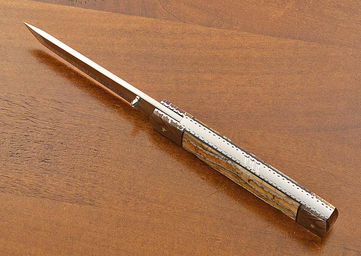 - 3 1/4" blade of ATS 34, satin finished flats, mirror polished bevels, 7 9/16" opened length