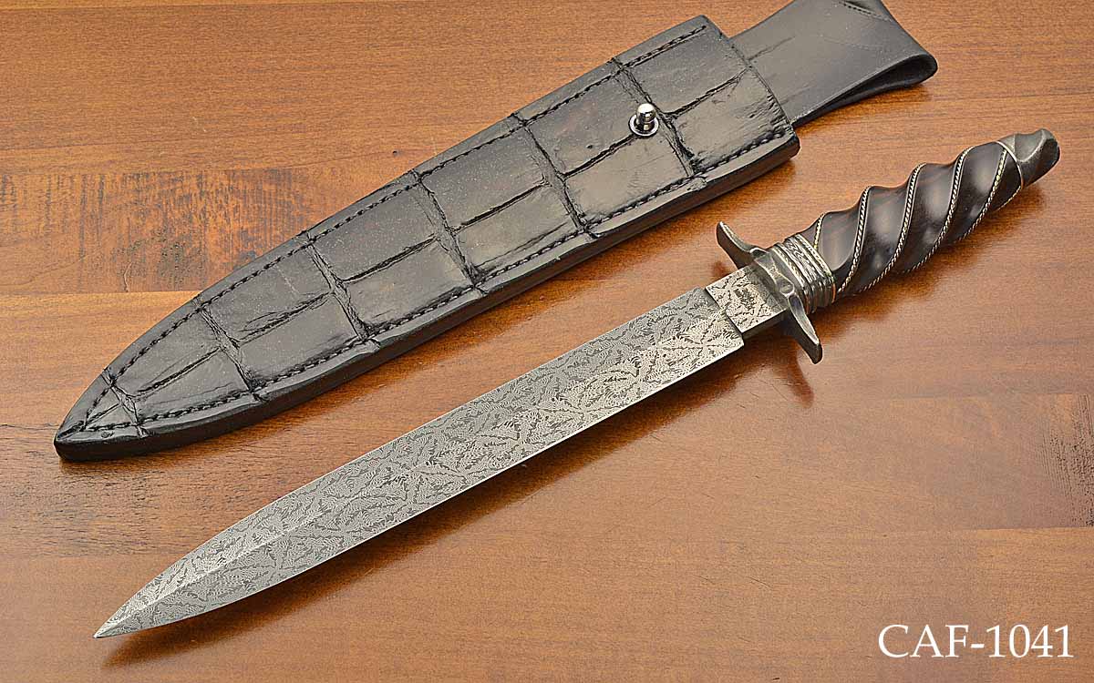 - 10 7/8" mosaic Damascus blade, forged by maker, 16" overall length