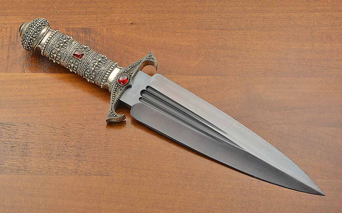 - Silver filigree hilt, handle, and pommel with 5 garnet cabochon inlays