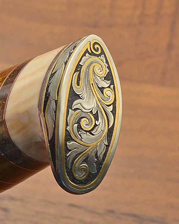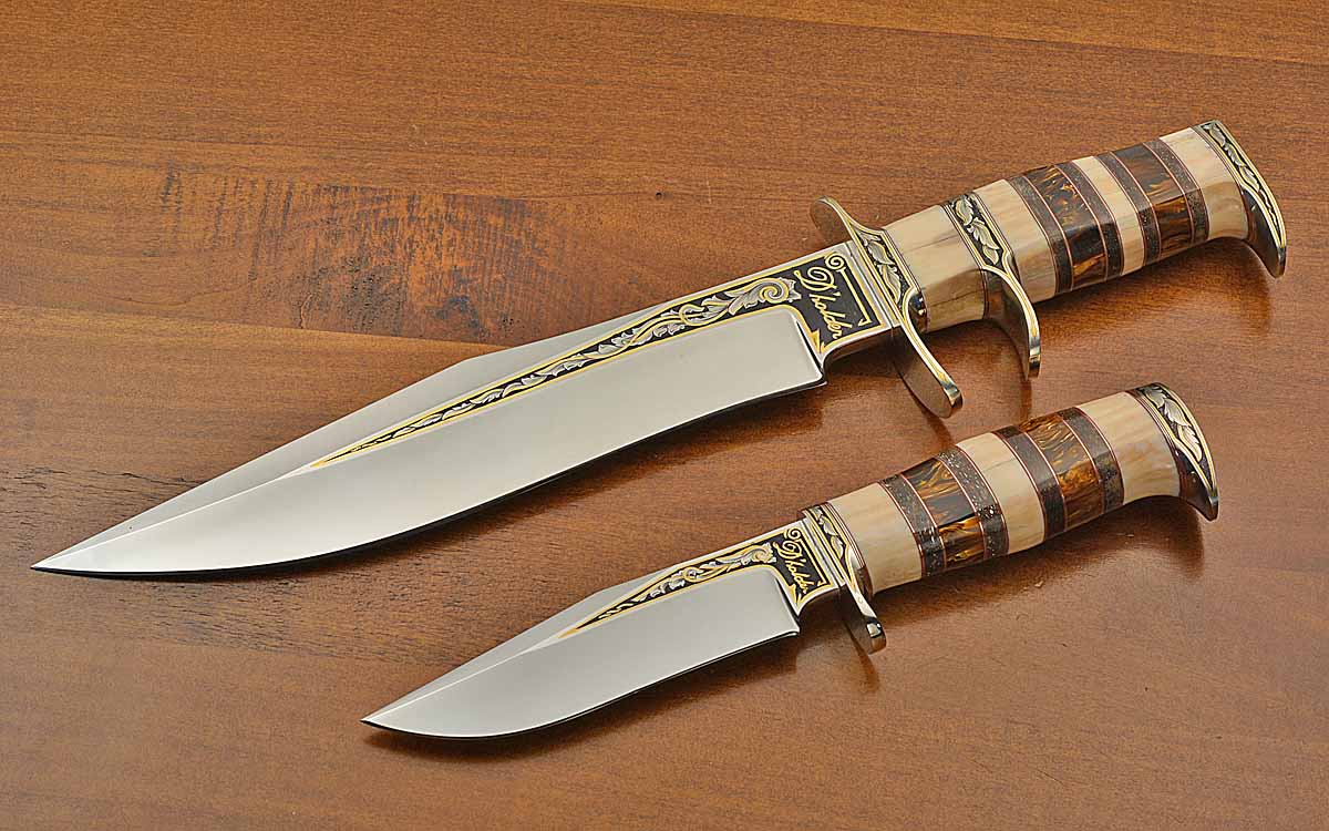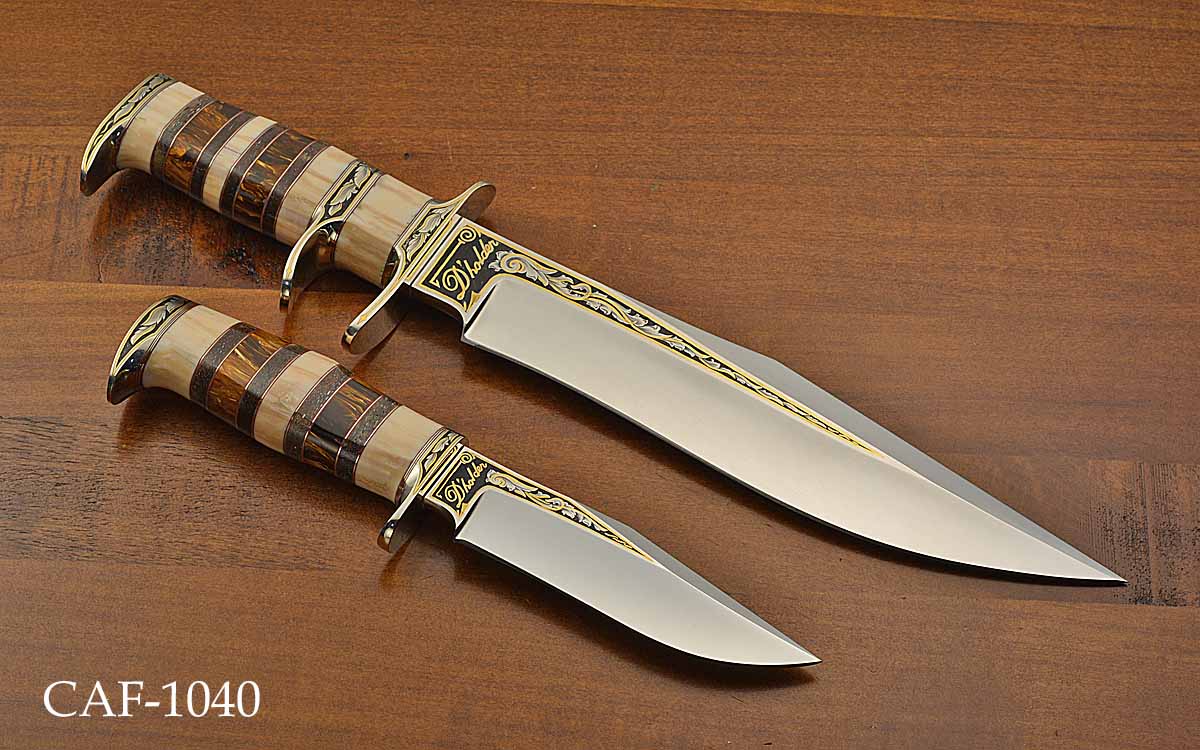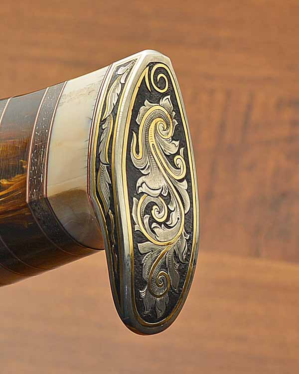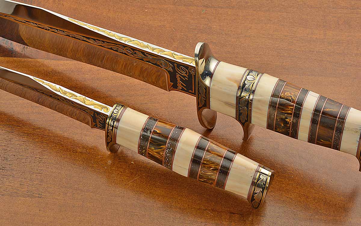 - Blades, blade spines, guards, and butt caps are engraved with significant gold inlays by BRUCE CHRISTENSEN