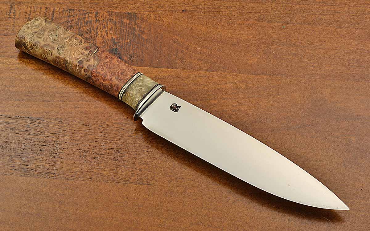 - Maple burl wood handle with musk ox horn spacer