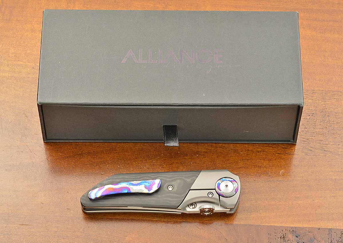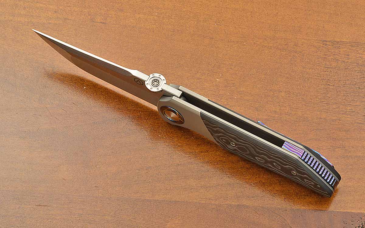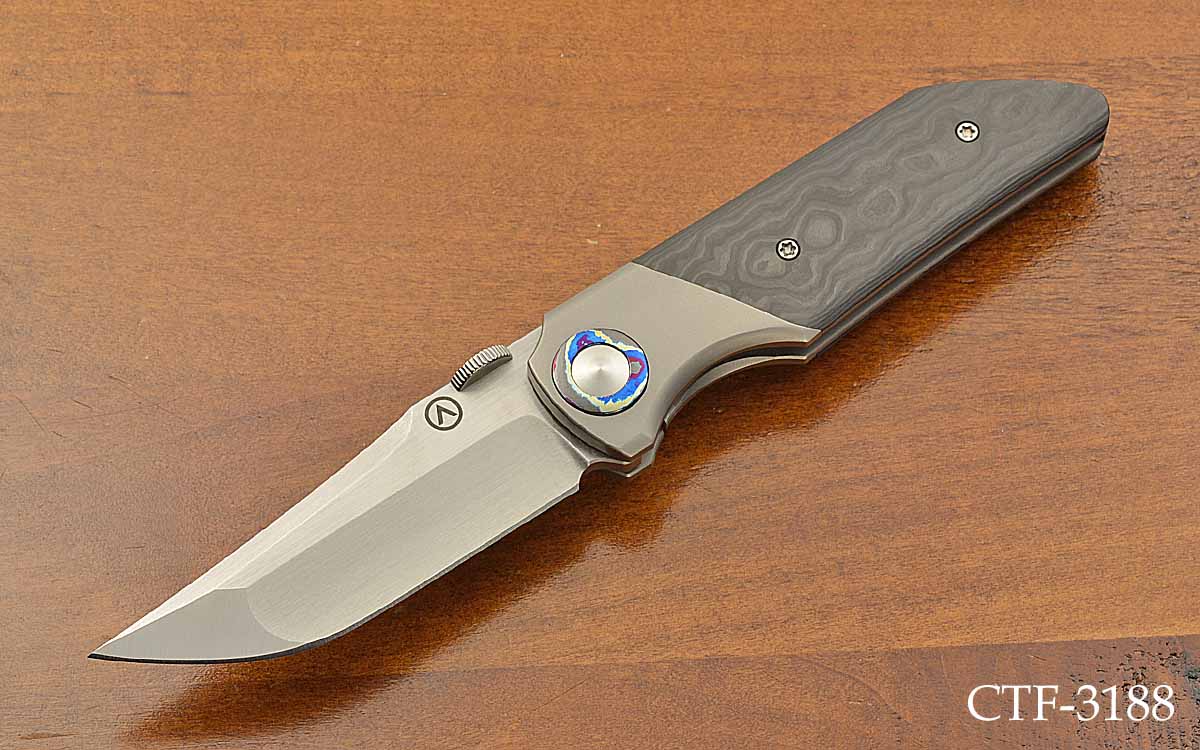 - Timascus pivot ring, pocket clip, and thumb notched back spacer