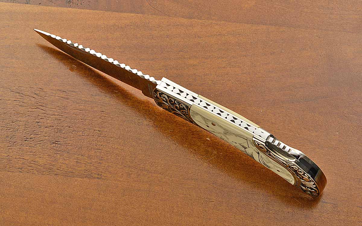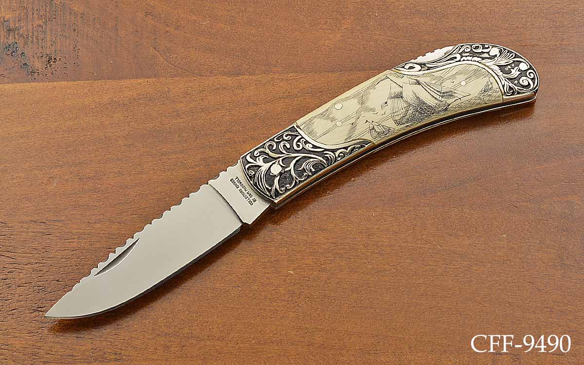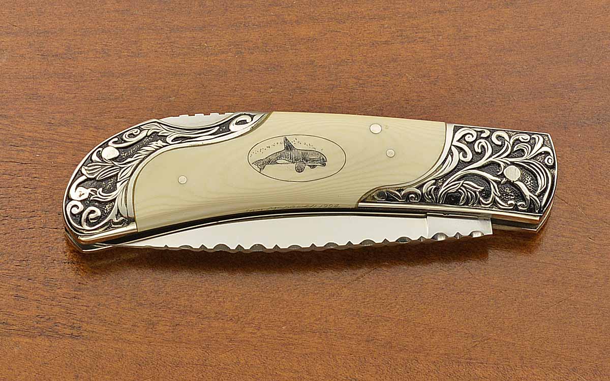 - Ivory micarta scales with black and white scrimshaw by SAM McDOWELL