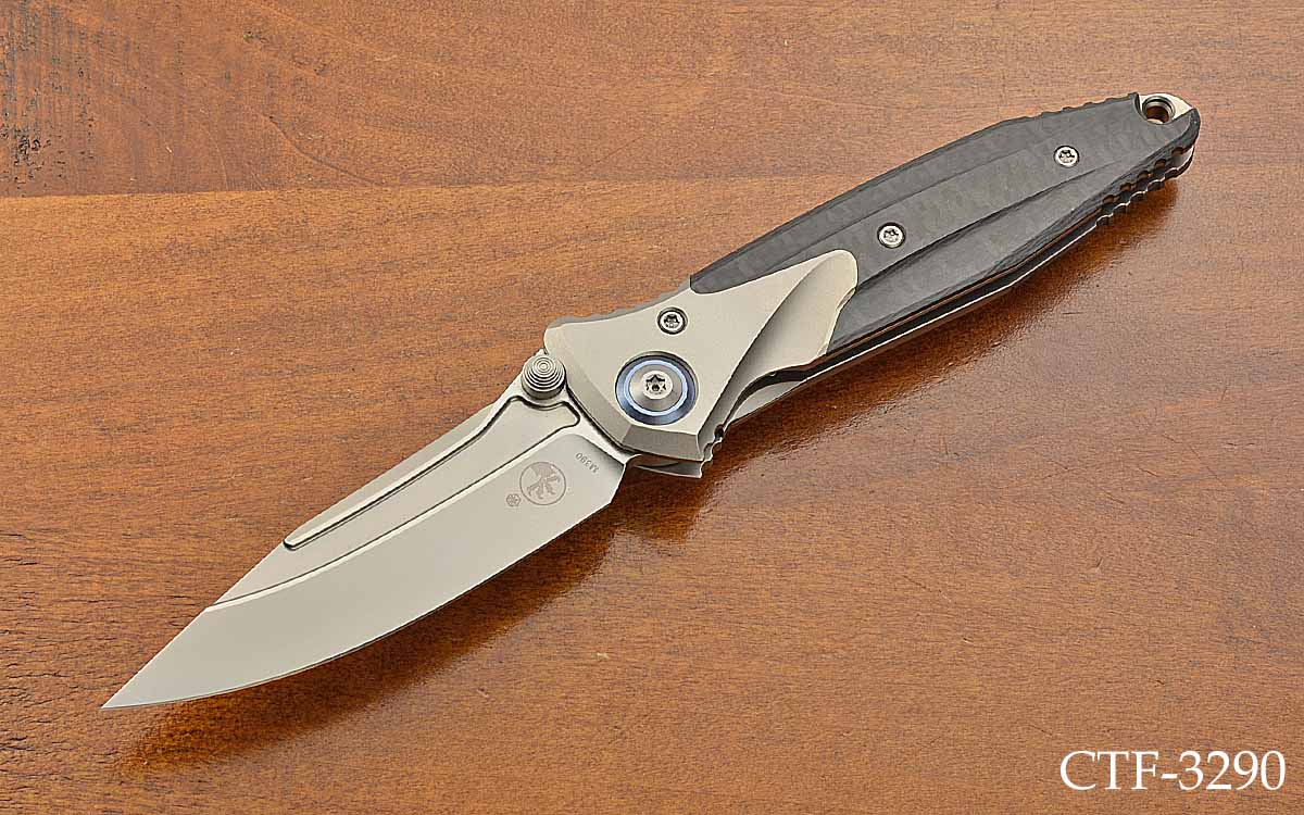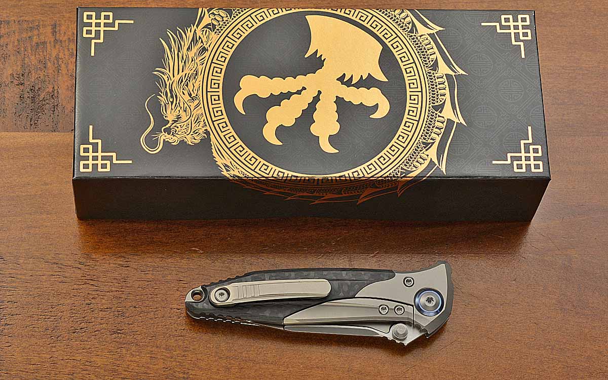 • 3 3/8" blade of M390, two-tone satin and glass blasted finish, 7 3/4" opened length