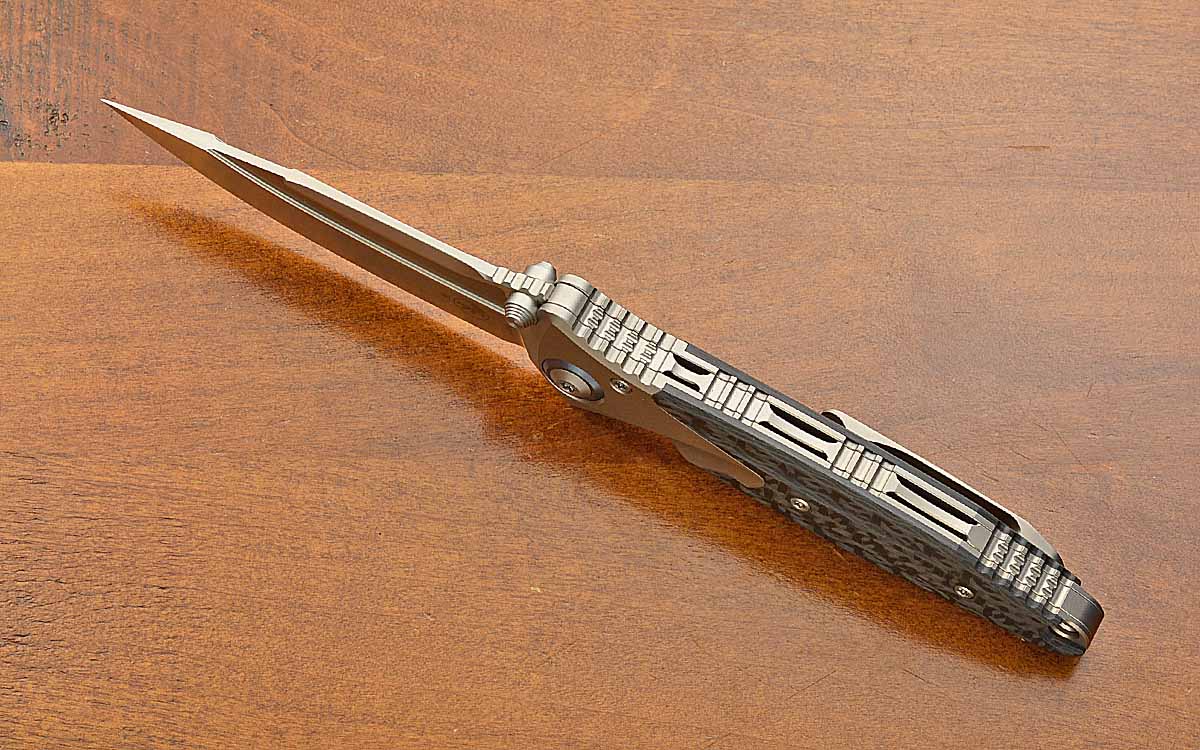 • Milled titanium bolsters, liners, and pocket clip with steel lock face insert