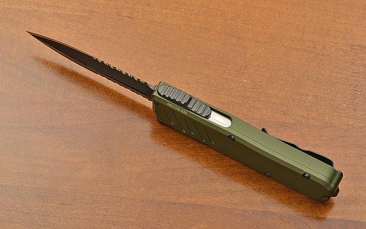 - 3 5/16" blade of Elmax, black coated finish, with serrations, 7 3/4" opened length