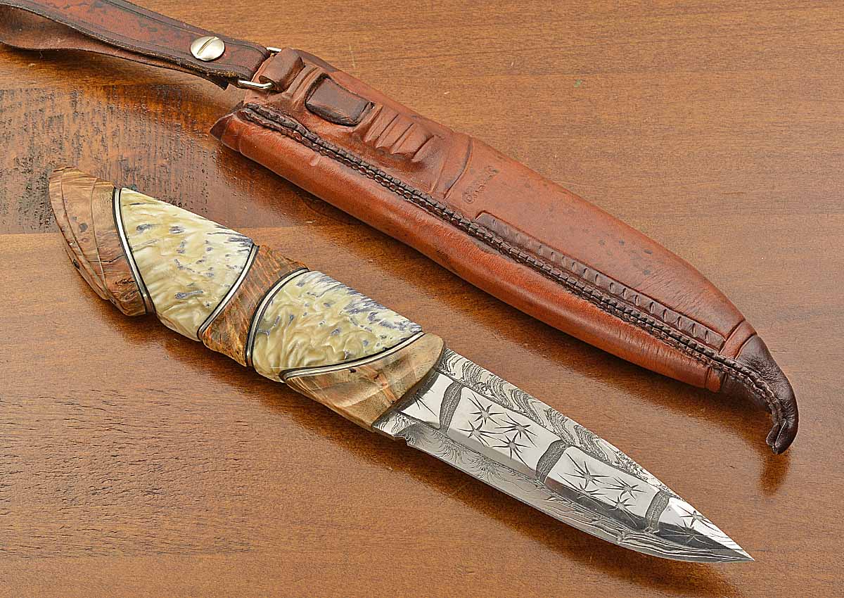 - 4 3/8" Star Force mosaic Damascus blade, 9 7/8" overall length