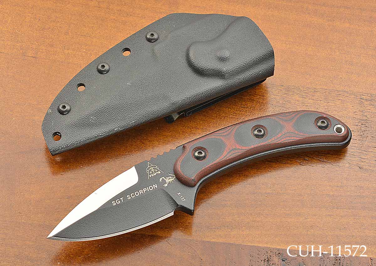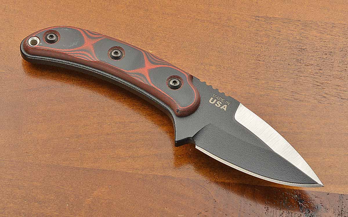 - 3 3/8" blade of 1095 carbon steel, black traction coating, 1/4" stock, 7 3/4" overall length