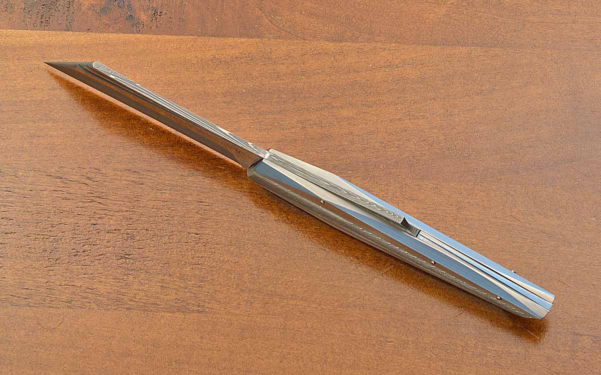 • 3 1/2" Damascus blade, satin finished flats, 8 1/8" opened length