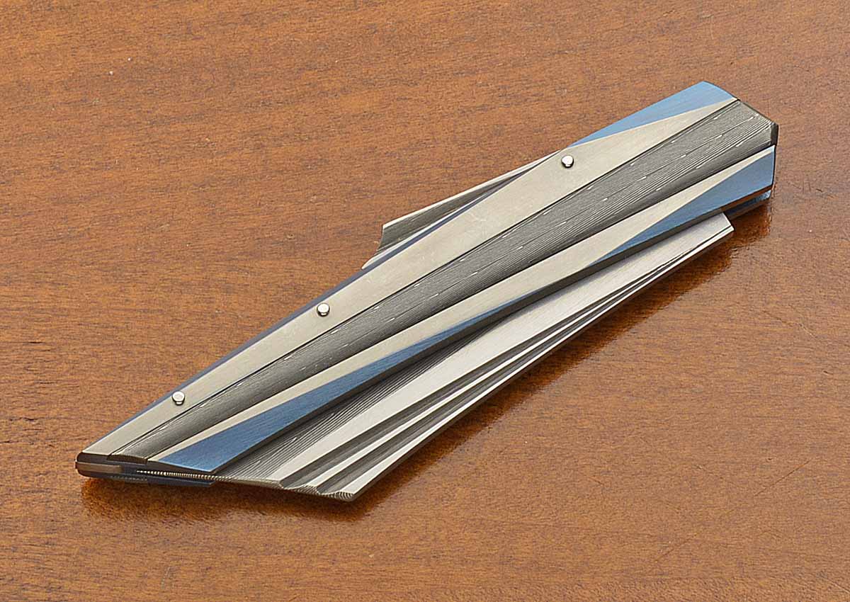 • Satin finished titanium frame with blue anodized accents and Damascus inlays