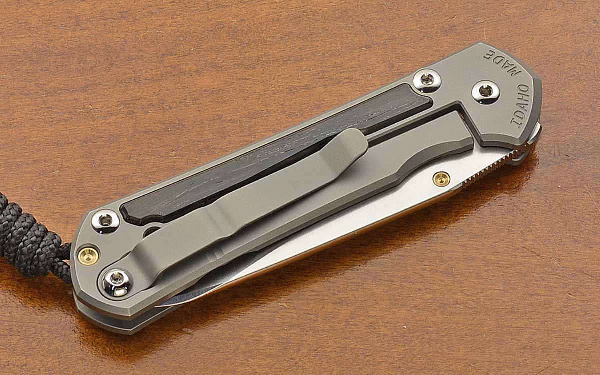 - Gold anodized titanium thumb stud, back spacer, and lanyard pivot