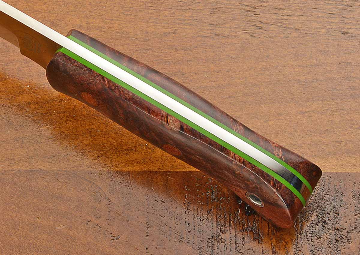 - Brick red maple burl wood scales with natural micarta pins and Toxic green liners