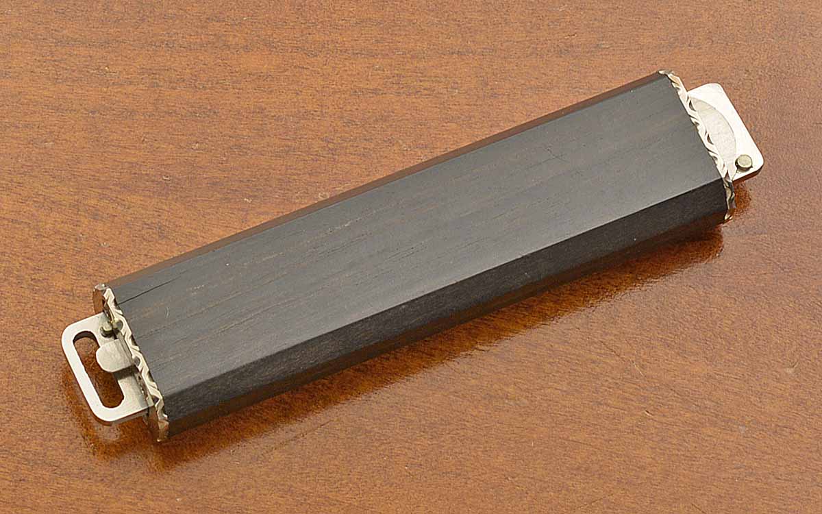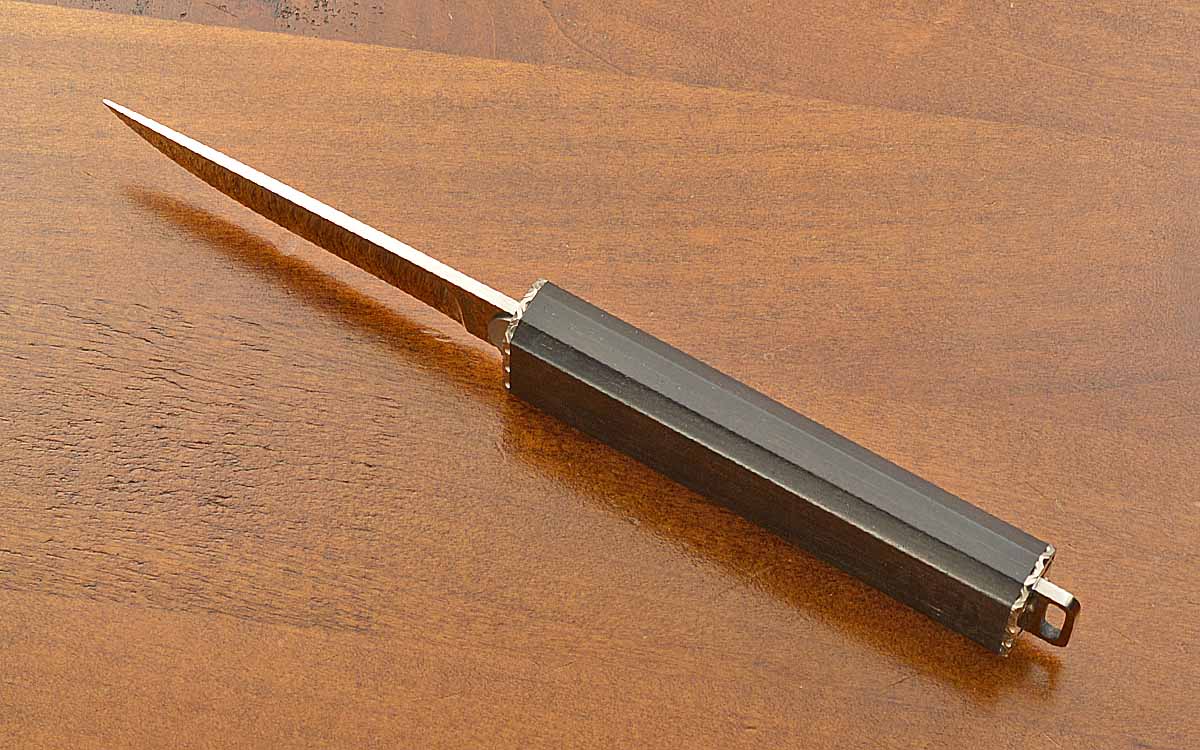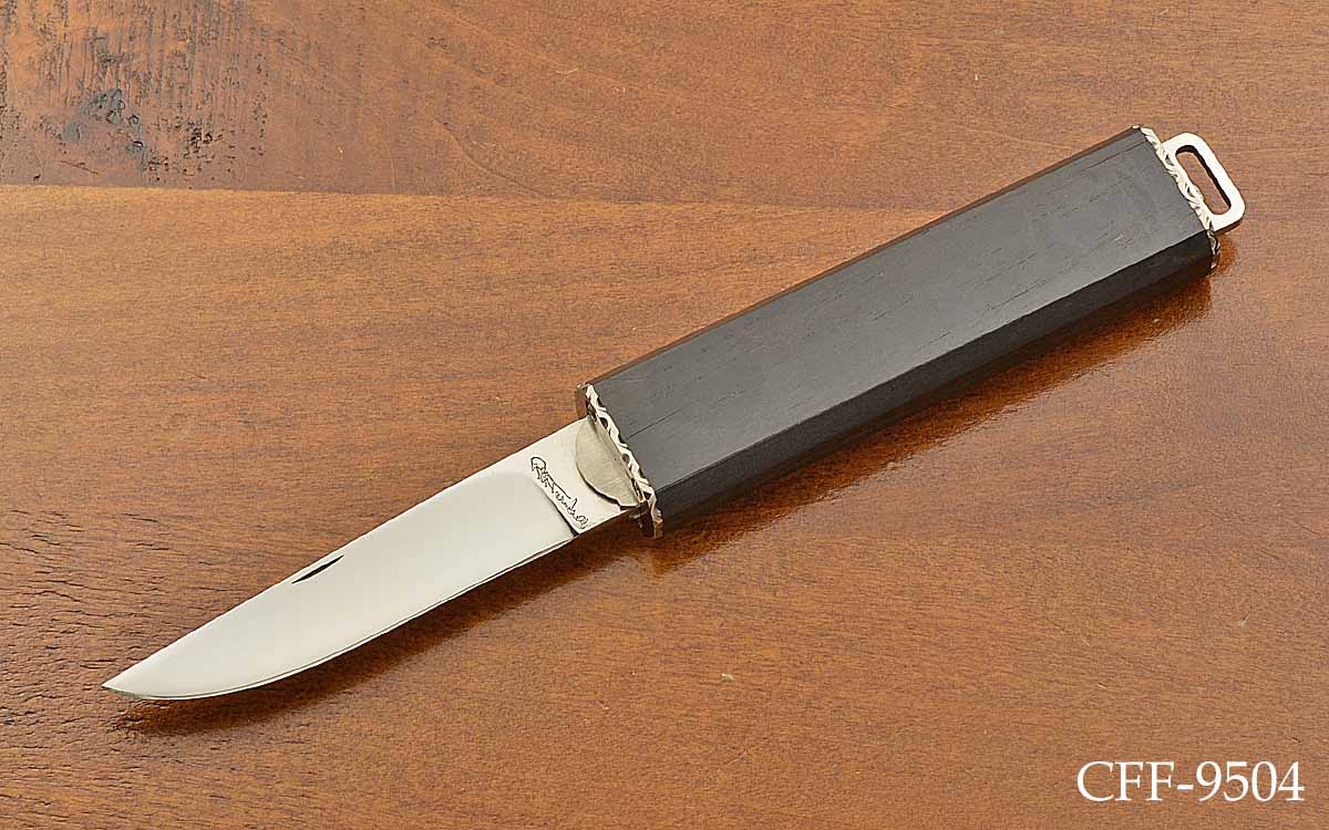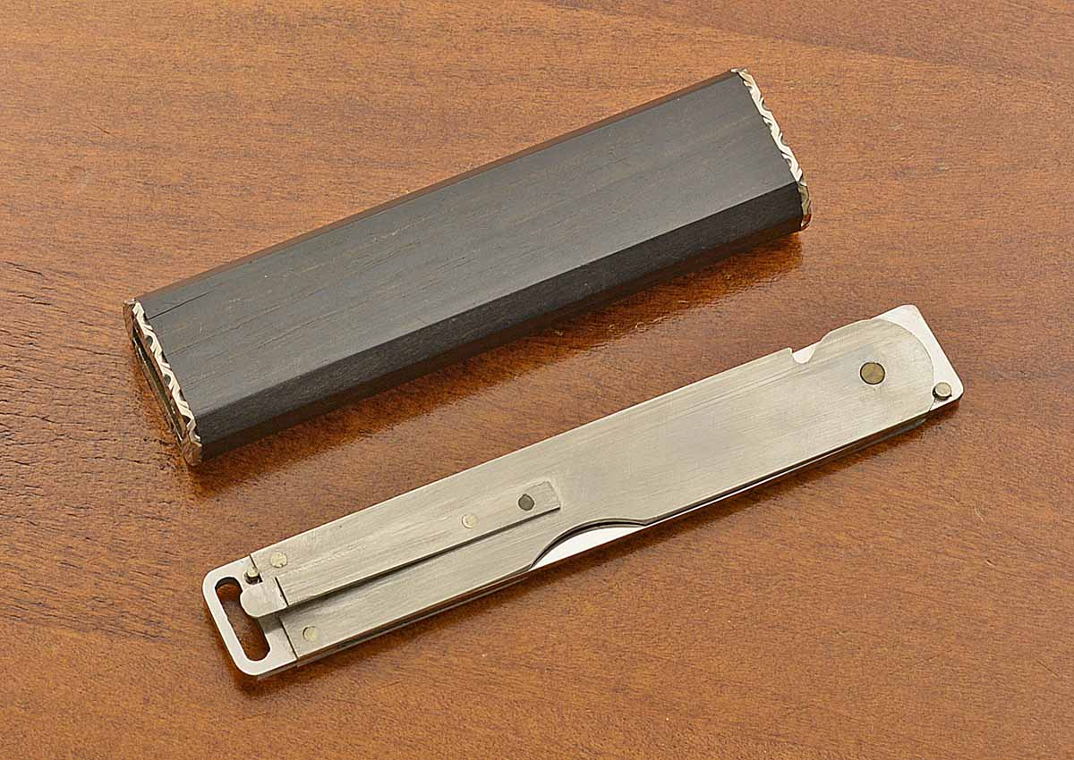 This knife has an unusual mechanism that allows it to fold and store in the handle. After depressing the locking tab, the blade and frame slide out of the handle. The blade is then rotated open and reinserted into the handle where it locks into place.
