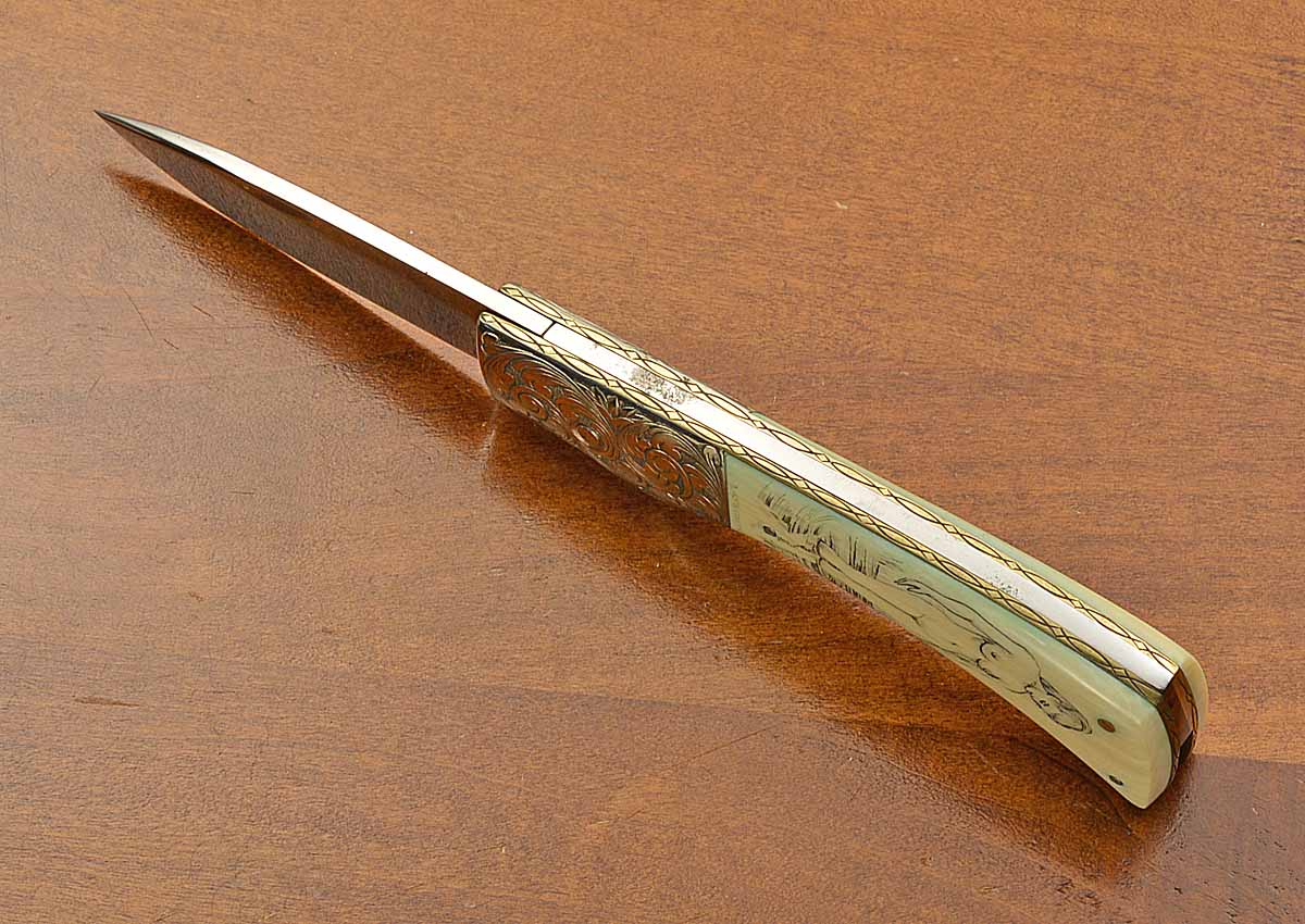 • Dovetailed ivory scales with scrimshaw by G. STEARNS