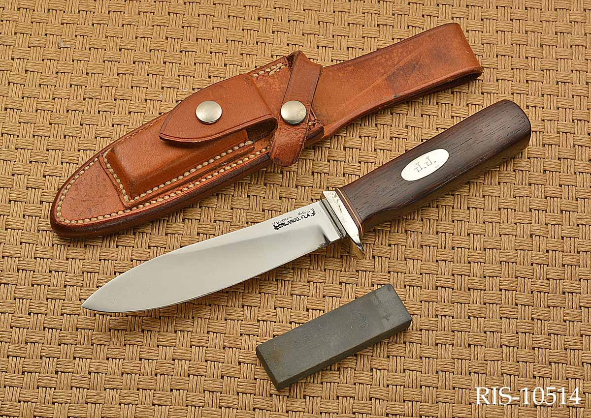 - Custom Johnson rough-back Model "A" leather sheath with Norton 2-tone stone