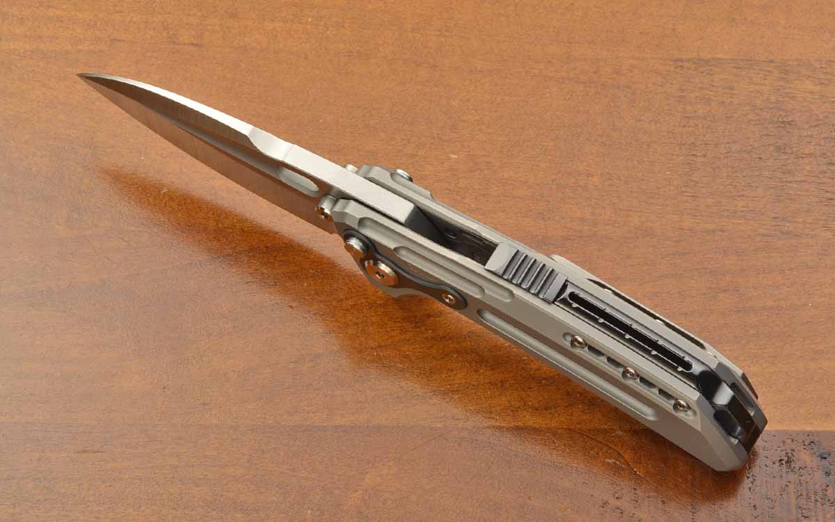 • 3 1/8" blade of M390, satin finish, 0.23" stock, 7 7/8" opened length