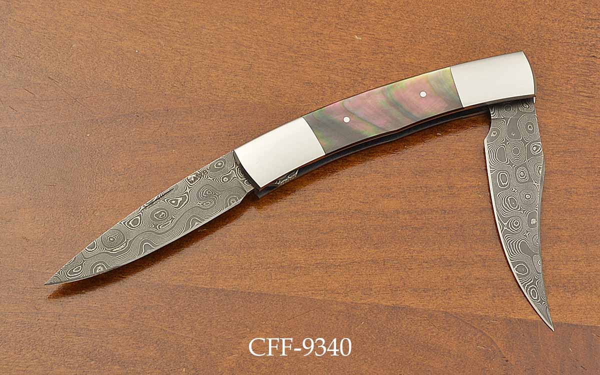 - 2 1/2" and 2 5/8" Raindrop Damascus blades, 3 1/4" closed length