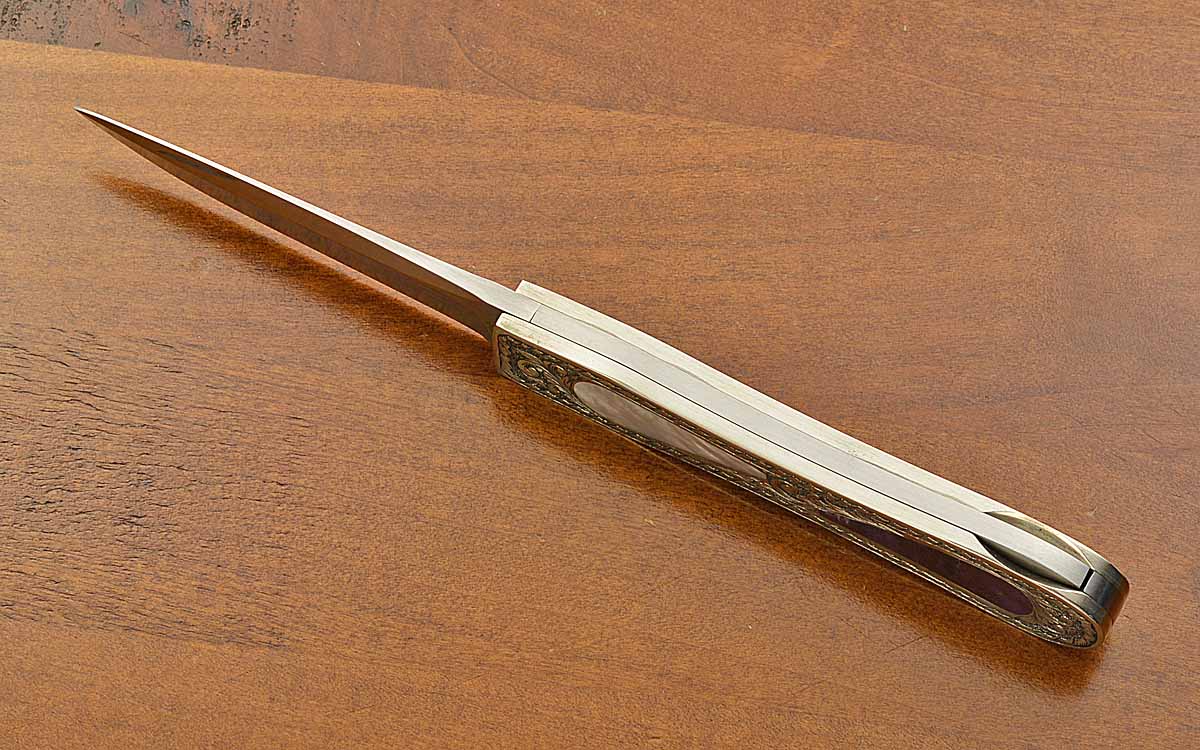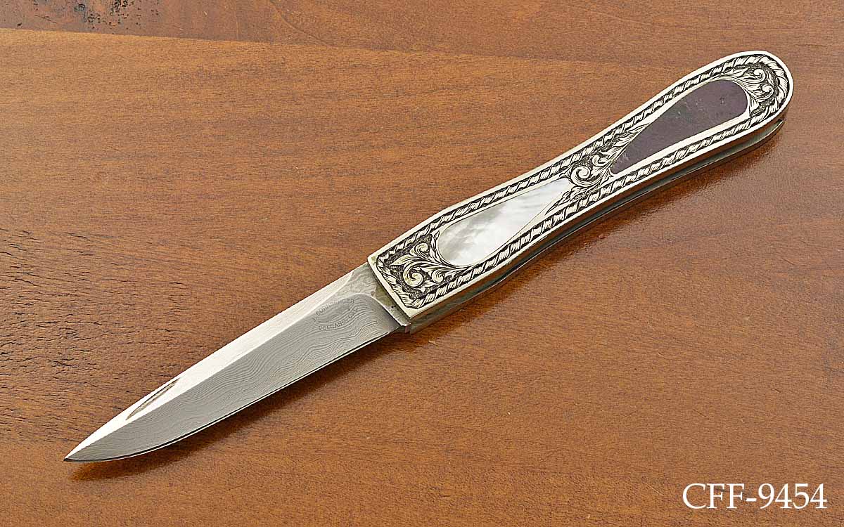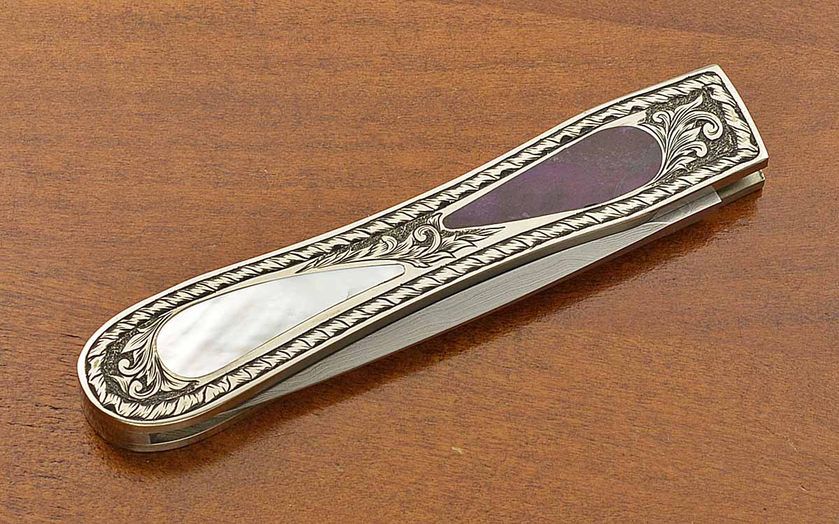 - Nickel silver interframe with engraving by maker and mother of pearl and charoite stone inlays