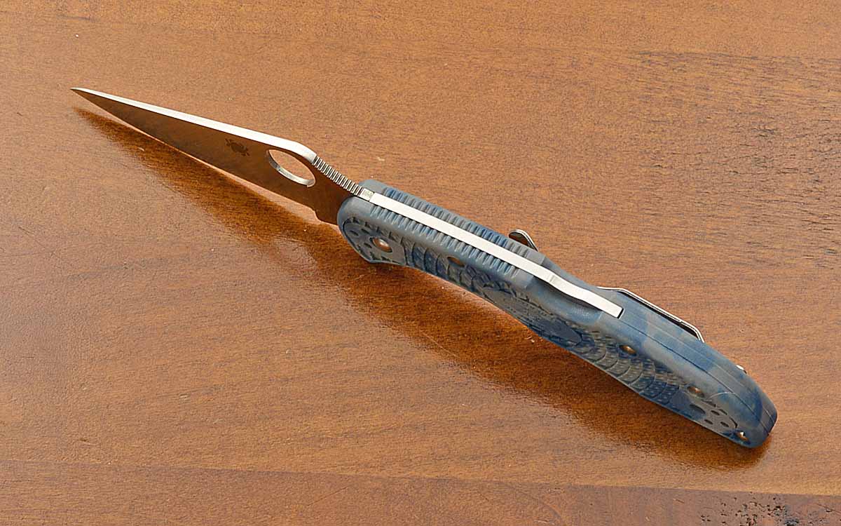 - 2 7/8" blade of laminated steel, Superblue core, SUS410 outer layers, 7 1/8" opened length
