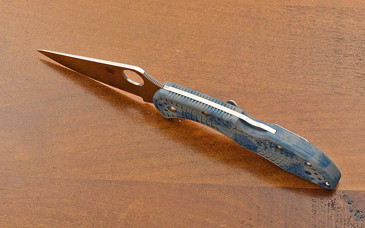 - 2 7/8" blade of laminated steel, Superblue core, SUS410 outer layers, 7 1/8" opened length