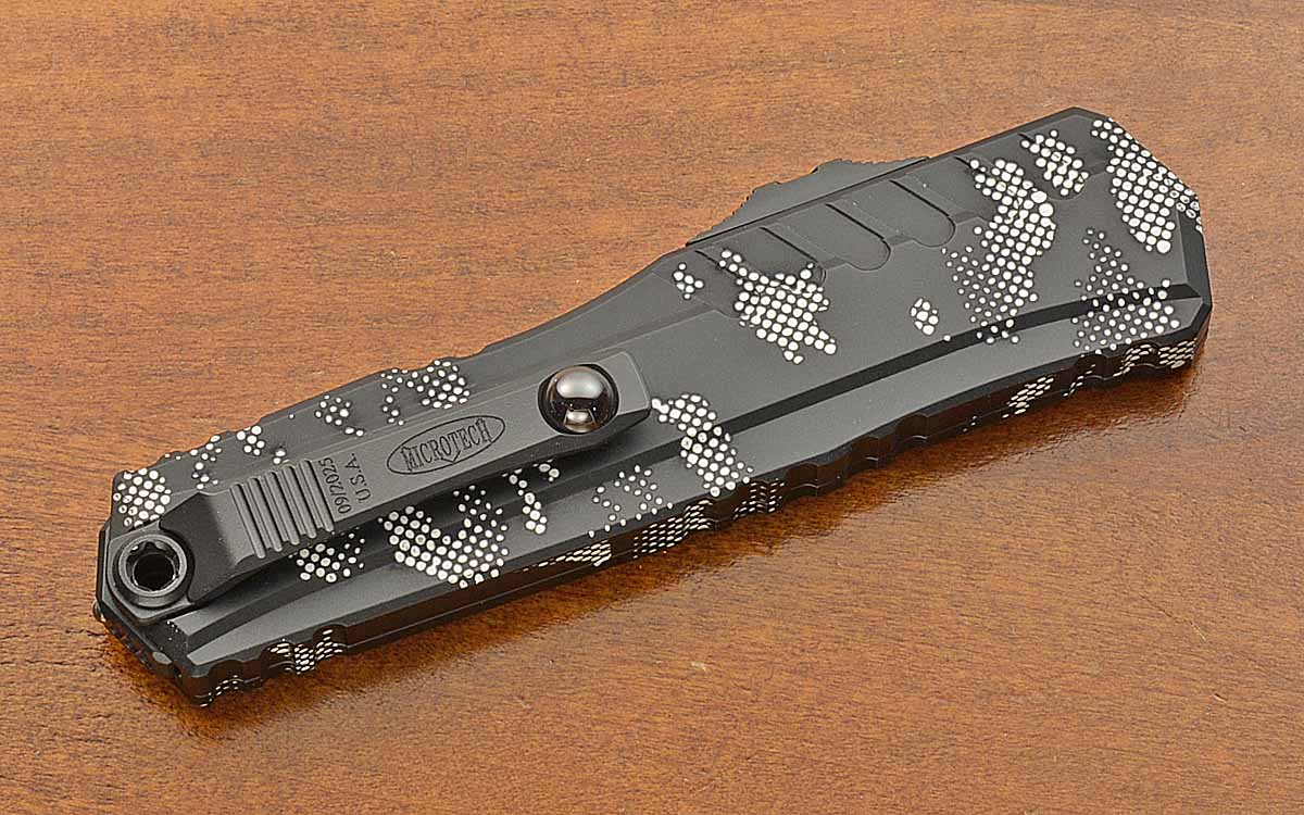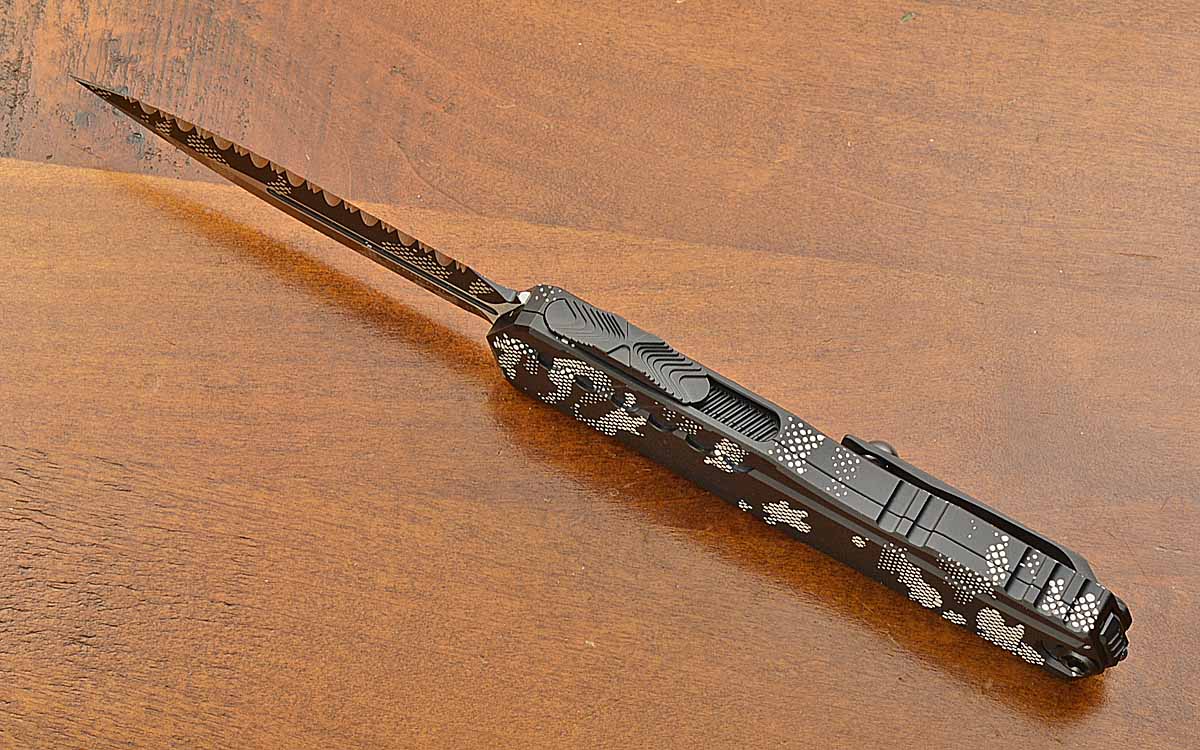 - 3 1/2" blade of M390MK, two-tone satin and Pixel Camo finish, fully serrated blade spine, 8 1/2" opened length