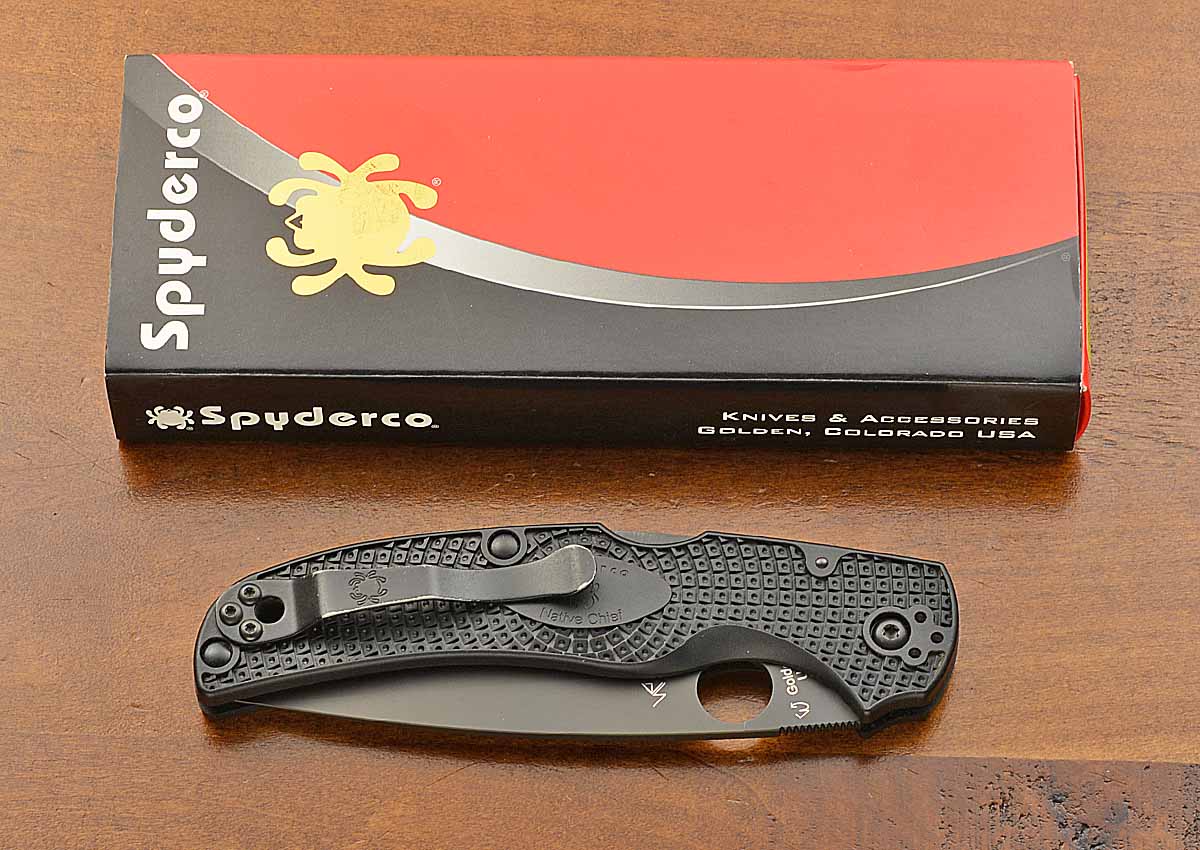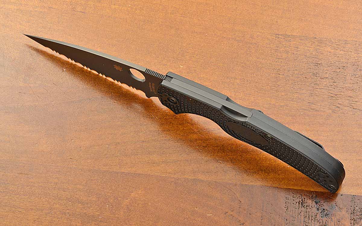 - 4 1/8" blade of CTS BD1N, fully serrated, black coated finish, 9 1/8" opened length