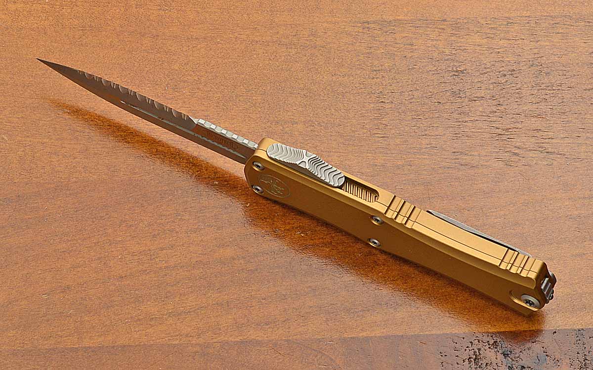 2 15/16" blade of M390MK, full serrated, Apocalyptic finish, 6 7/8" opened length