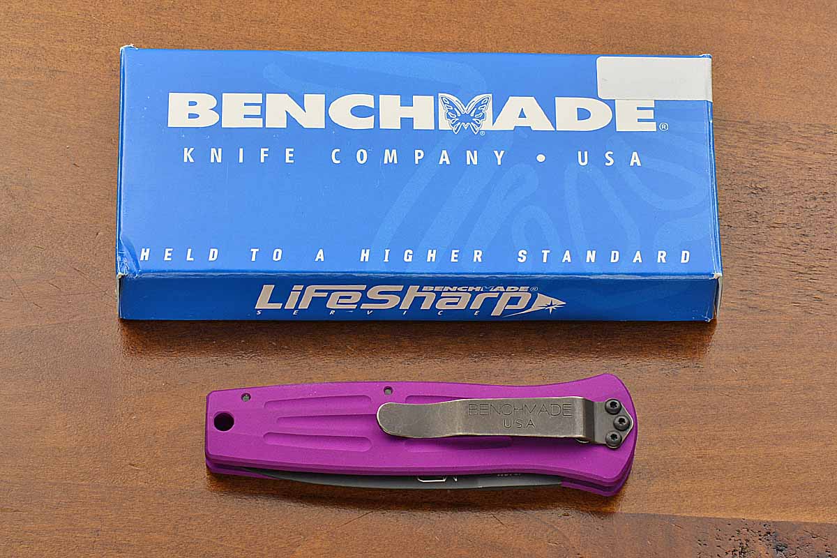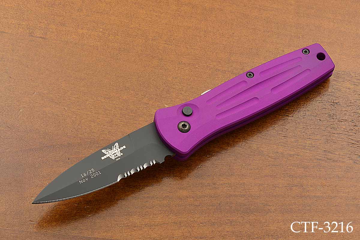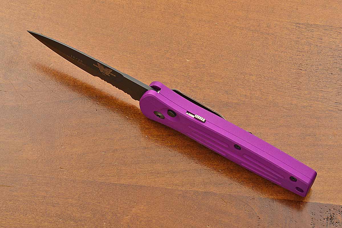 - 3" blade of 154CM, black coated finish, with serrations, 7" opened length